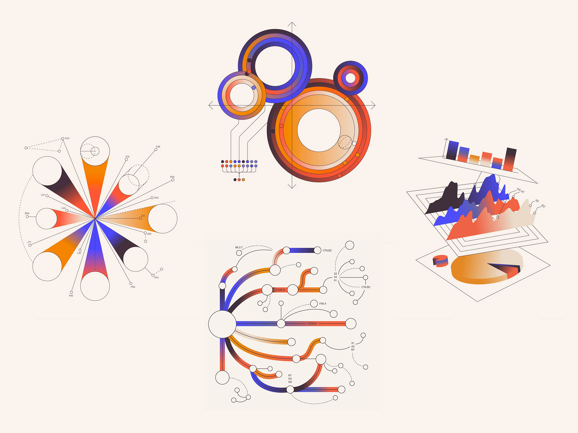 定制的字標采用了單線腳本風格,垂直線條節(jié)奏精準,圓潤有力。圖標部分,則將條形圖巧妙地融入了一朵盛開的百合花中,寓意著讓數(shù)據(jù)如花朵般綻放。為了進一步強化研究基礎上創(chuàng)意內(nèi)容的理念,Hoodzpah還開發(fā)了一種獨特的抽象且生動的數(shù)據(jù)可視化插圖風格。