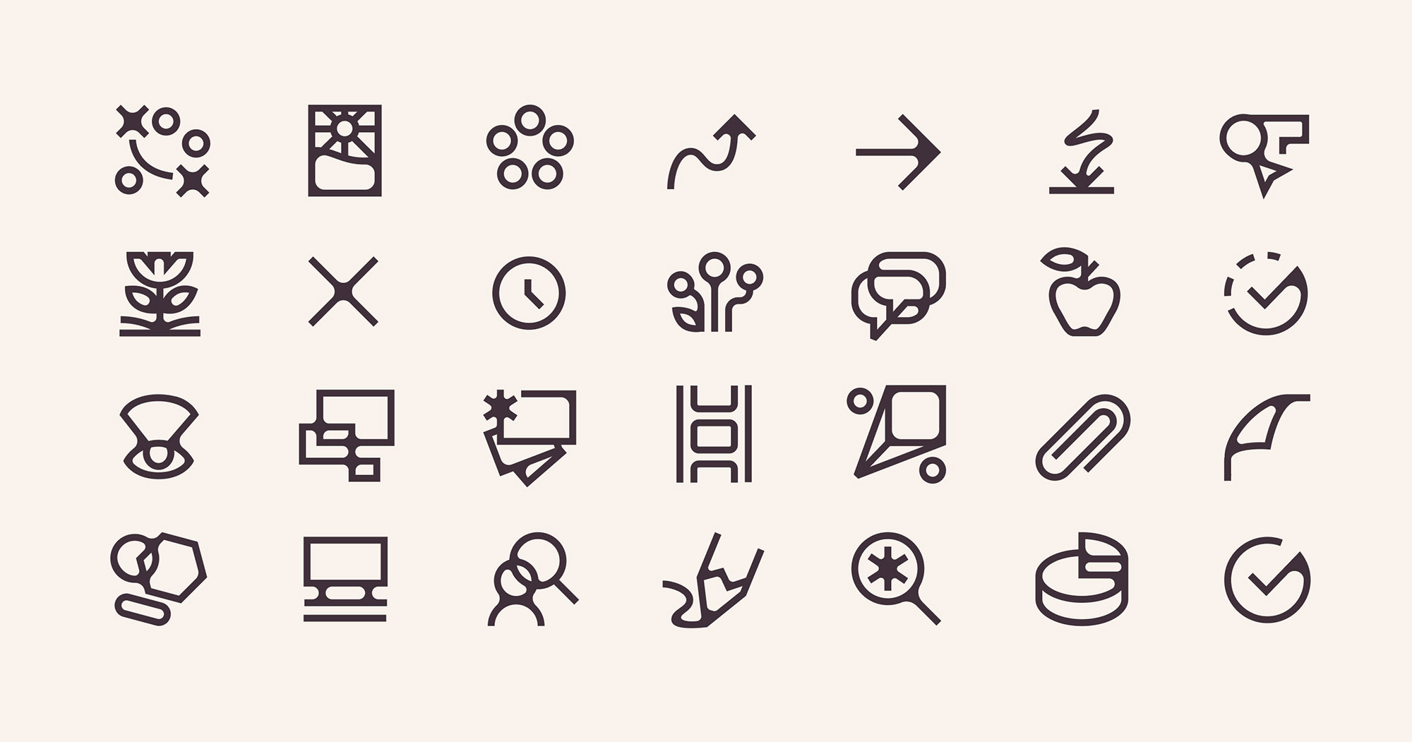 除了logo和色彩設計外,Datalily的品牌形象還包括了一套優(yōu)秀的圖標集。這些圖標在美學上與logo和字標完美融合,并采用了Hoodzpah所稱的“blurpy”角落設計,即一種墨水膨脹的效果,為品牌增添了一份獨特的韻味。此外,品牌字體選擇也頗為講究,雖然主字標和Haben字體在風格上有所沖突,但選擇了更為內(nèi)斂的TWK Lausanne字體,以及作為單線字體的Ballinger Mono,使得整體設計既和諧又富有層次感。