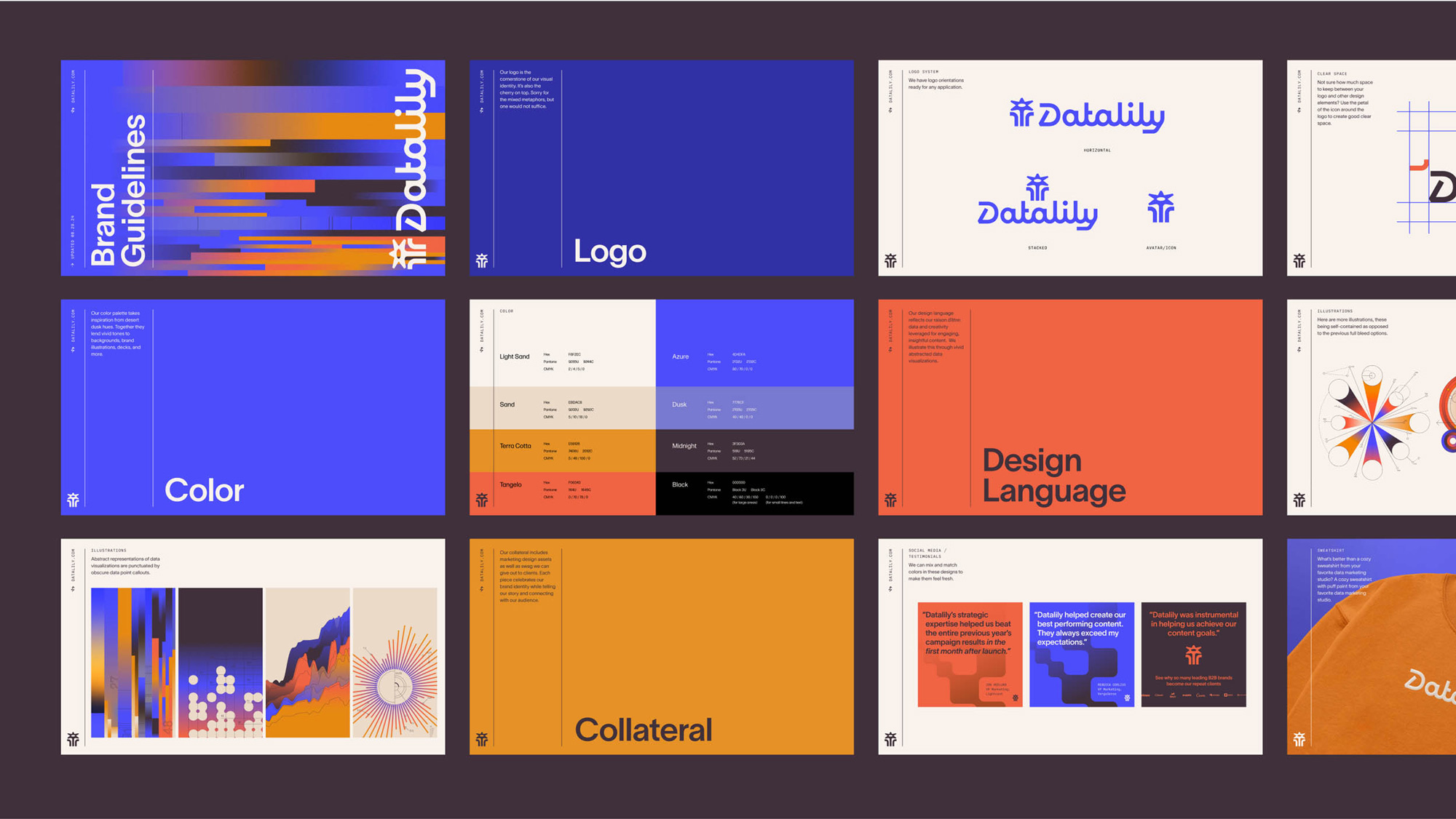 在品牌色彩方面,Datalily選擇了一系列既數(shù)據(jù)感又充滿魅力的顏色作為品牌識別的基石。這些顏色在插圖中得到了充分運用,即使它們并沒有特定地繪制任何圖表,也成功地傳達了Datalily能夠將復雜數(shù)據(jù)呈現(xiàn)得既易懂又酷炫的理念。