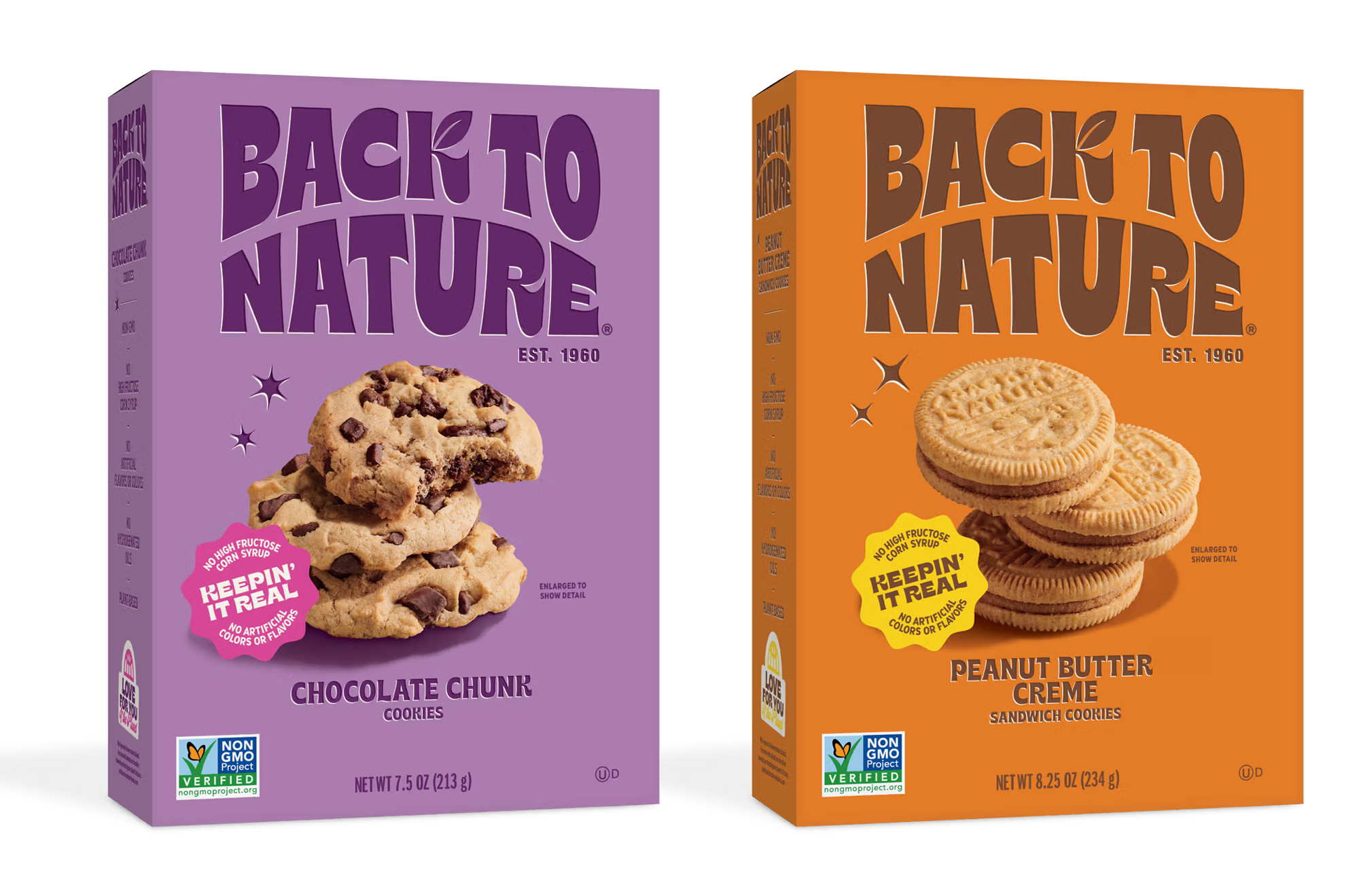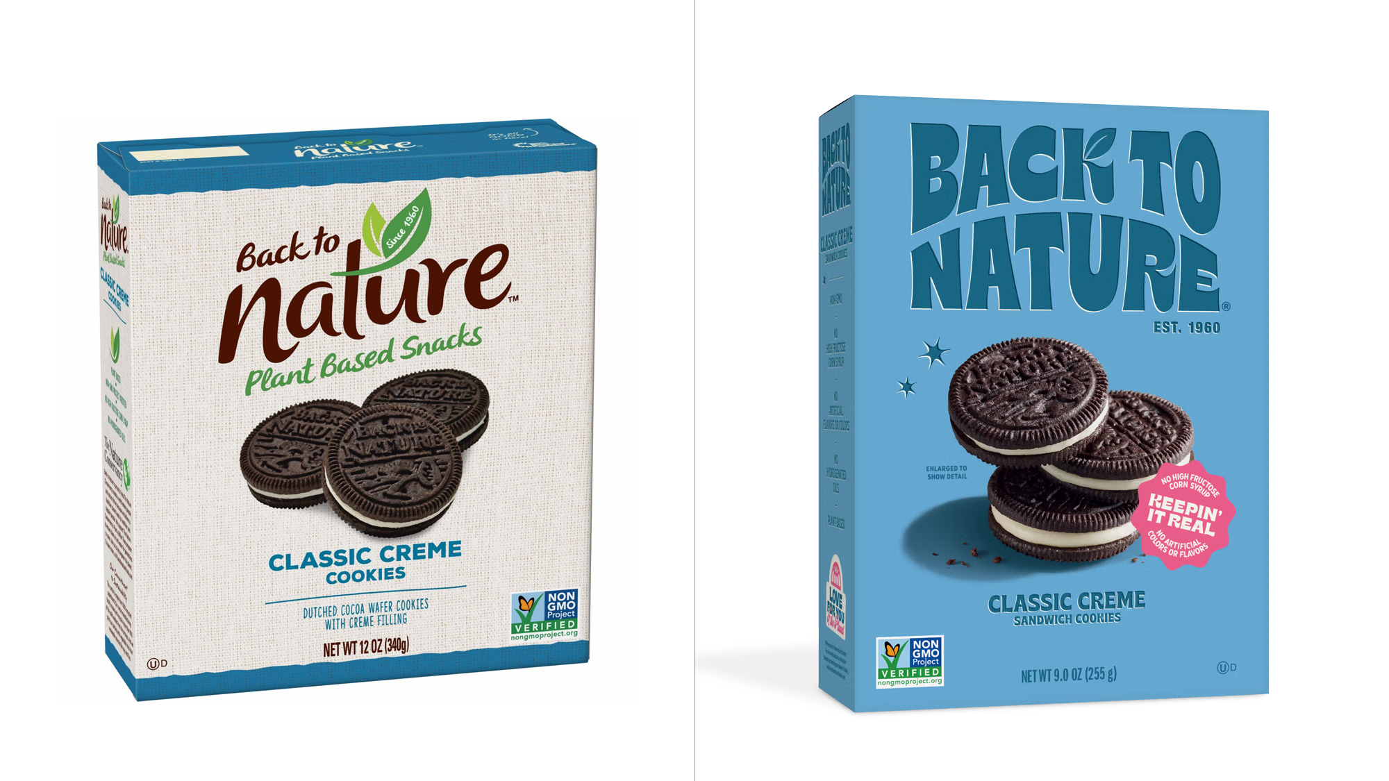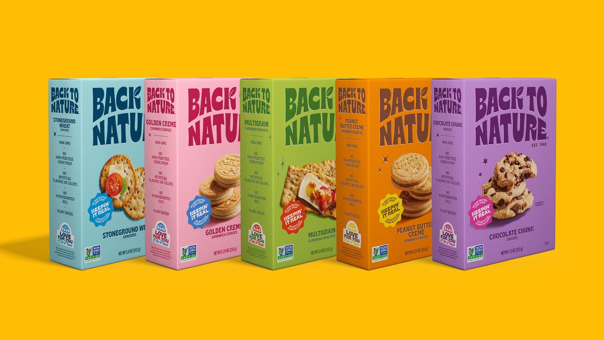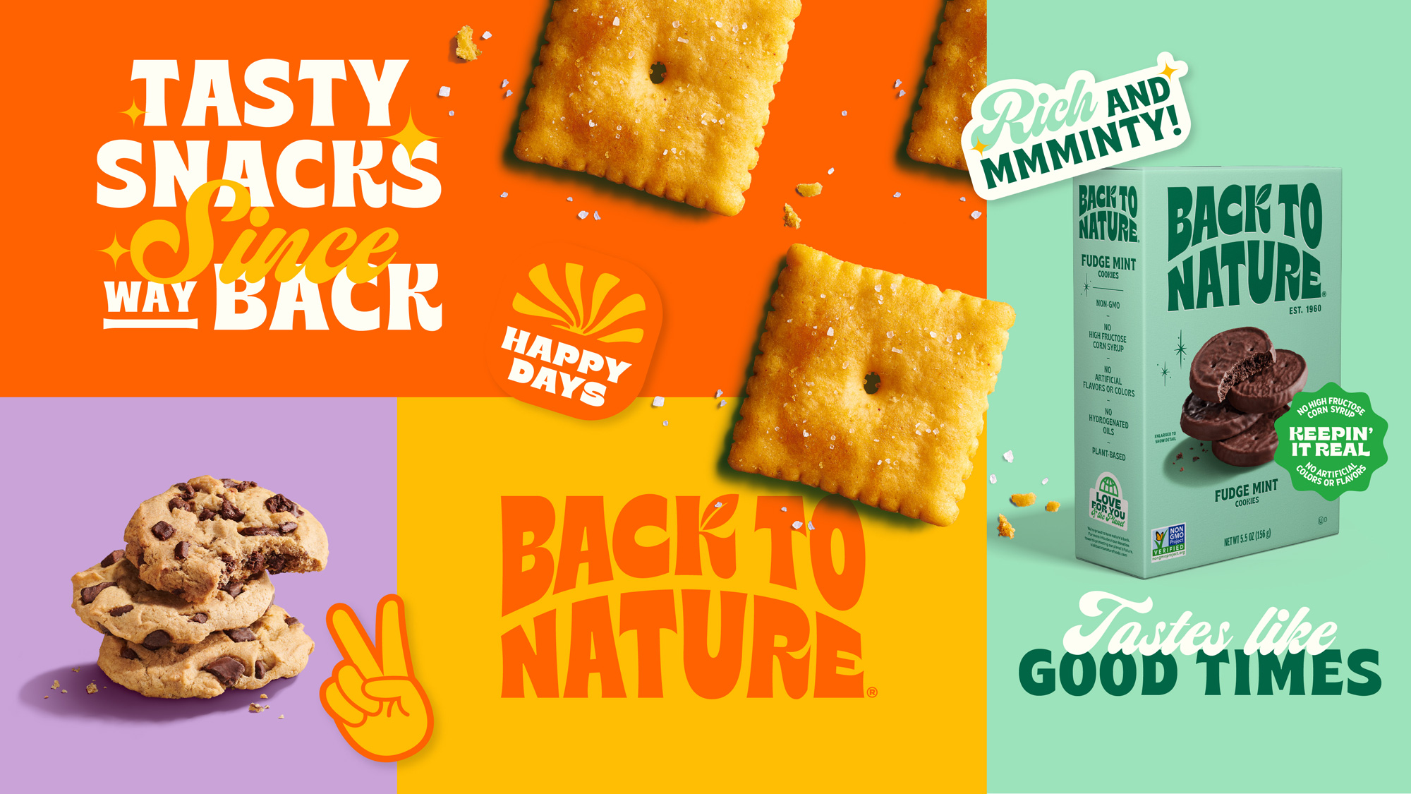 Back to Nature成立于1960年,是美國植物基零食領(lǐng)域的先驅(qū)品牌,主打非轉(zhuǎn)基因餅干、麥片等產(chǎn)品。隨著市場飽和與消費者審美迭代,品牌原有視覺形象(如傳統(tǒng)手寫字體與樹葉元素)顯得過于保守,難以吸引年輕群體。2023年,品牌委托英國曼徹斯特設計公司LOVE,啟動全面VI設計升級,目標是通過視覺語言傳遞“活力與美味”而非“無添加”的刻板印象。