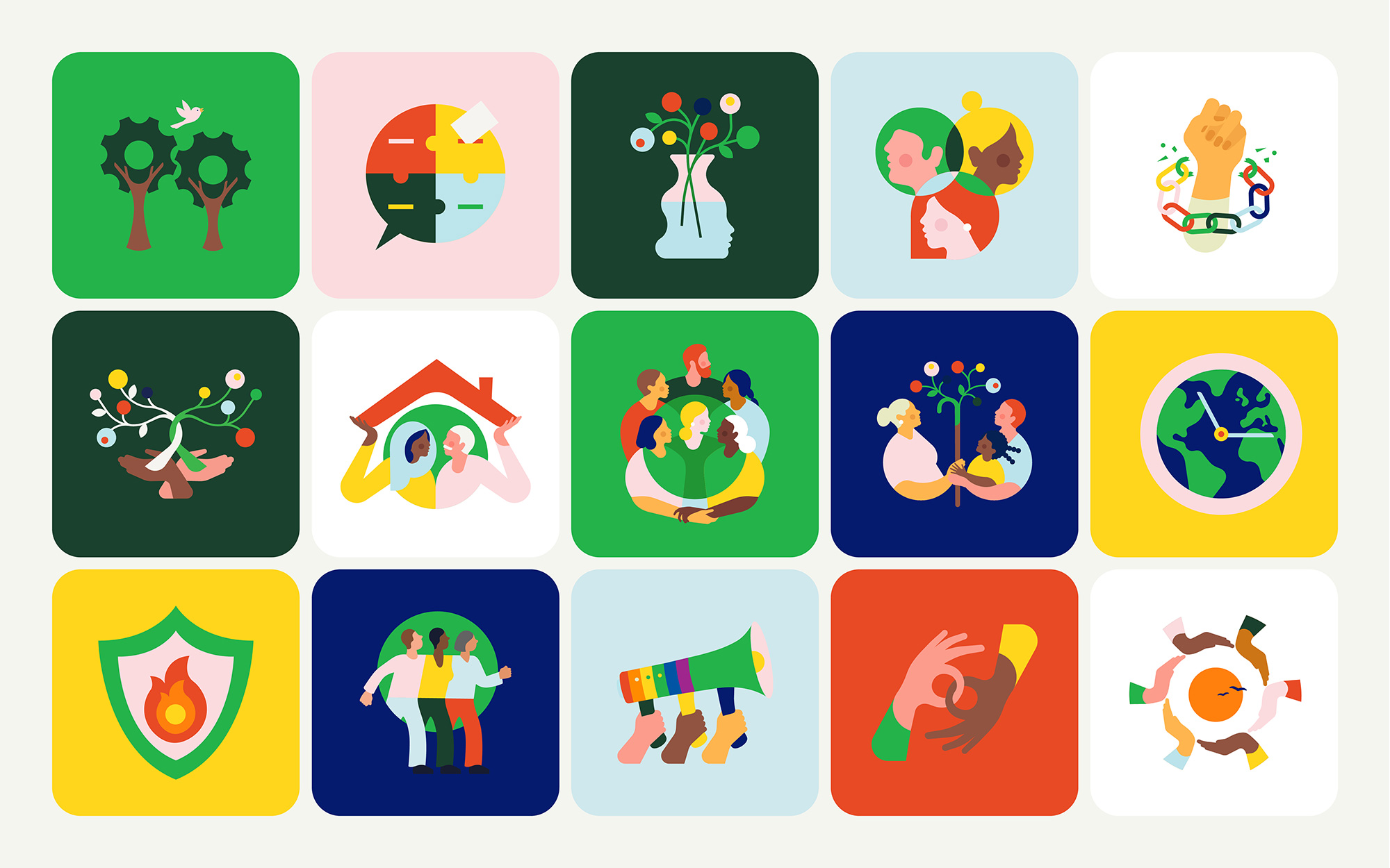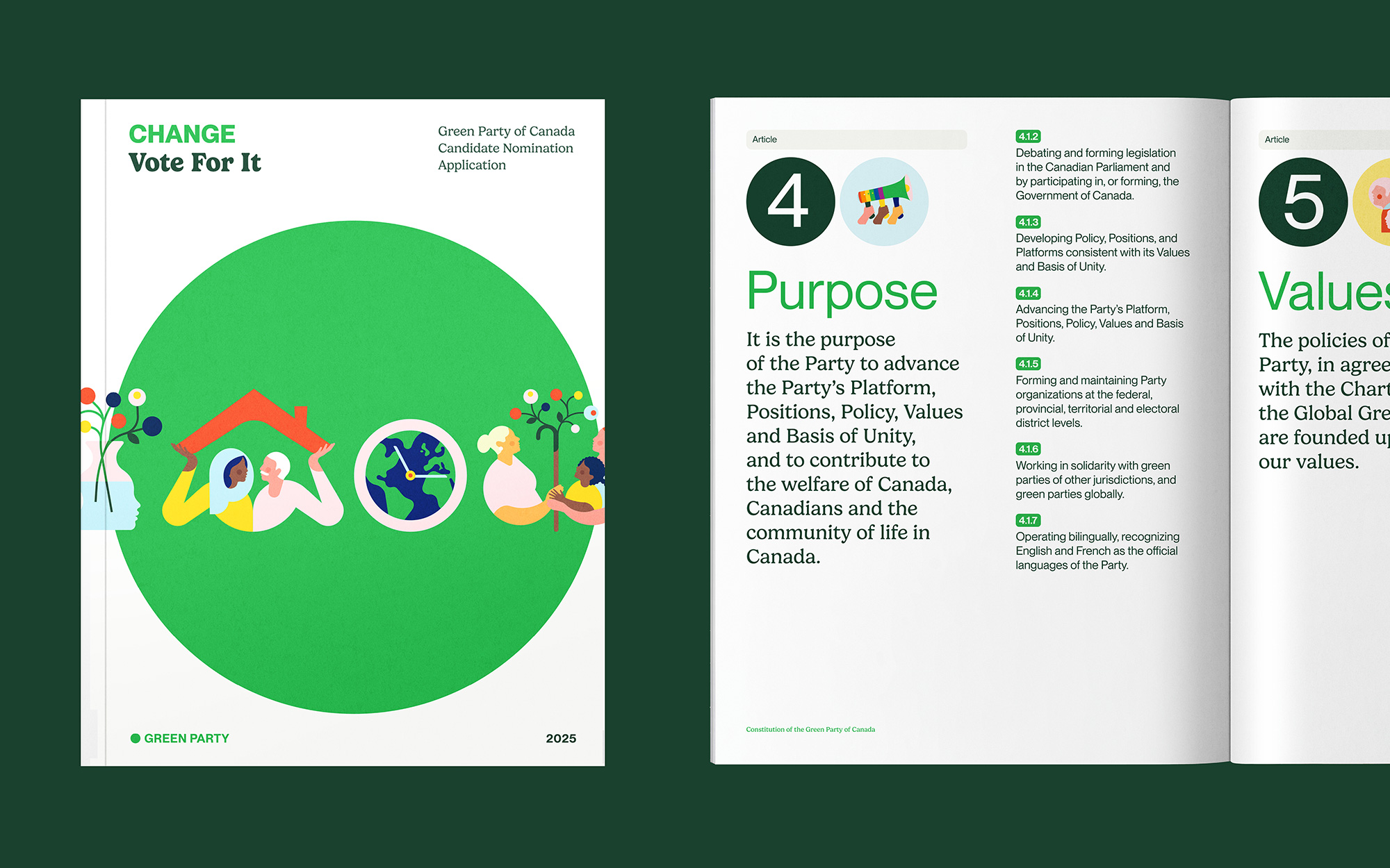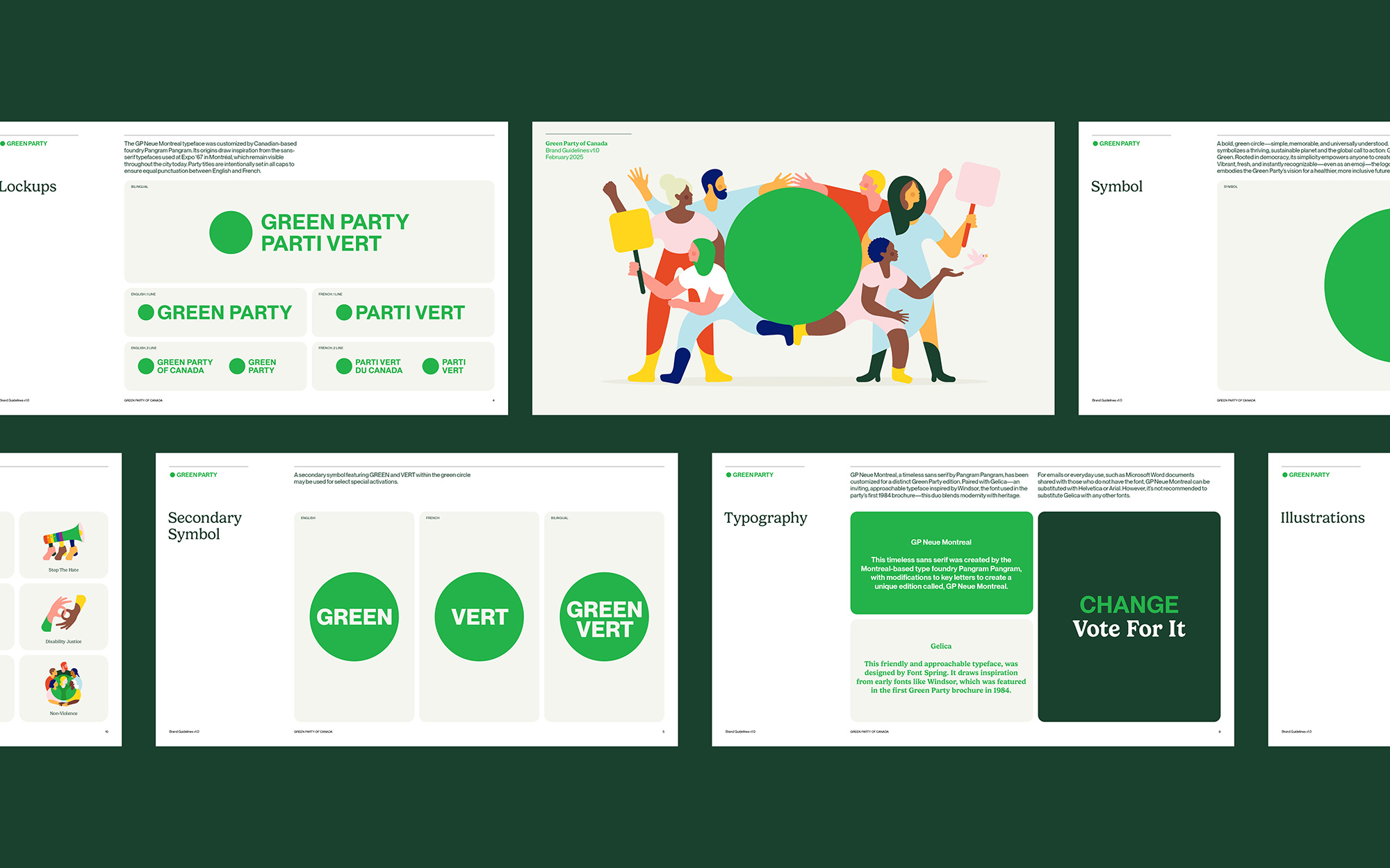 加拿大綠黨(Green Party of Canada)成立于1983年,作為聯(lián)邦政壇第五大黨派,長期聚焦生態(tài)智慧、社會正義等六大核心原則。2024年,為突破傳統(tǒng)政治符號的刻板印象,綠黨啟動品牌形象全面升級,攜手溫哥華設計工作室Tomorrow,以“綠色圓點”為核心符號,構建全民參與的視覺體系。新標識通過200余場線上工作坊,邀請黨員、志愿者及選民共同創(chuàng)作,確保設計策略的深度共鳴。