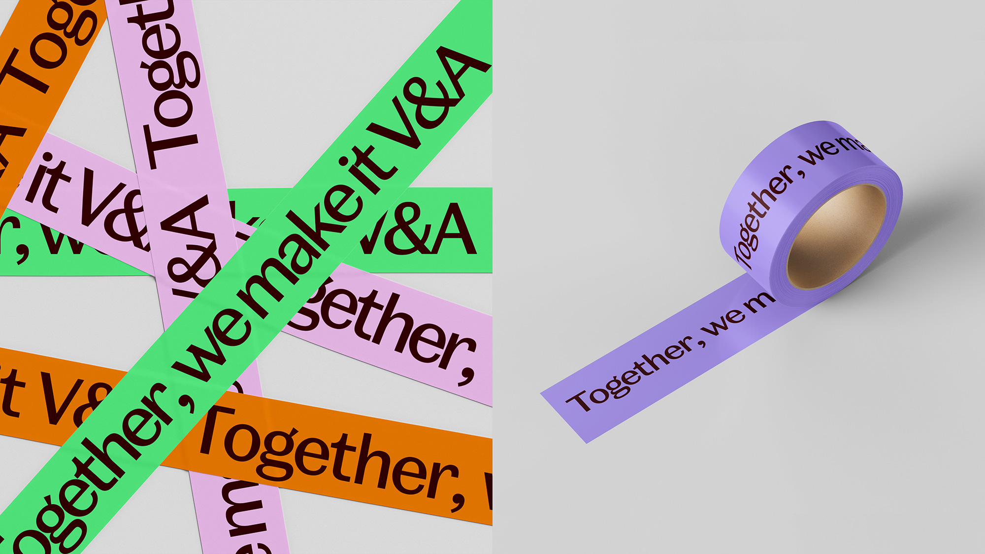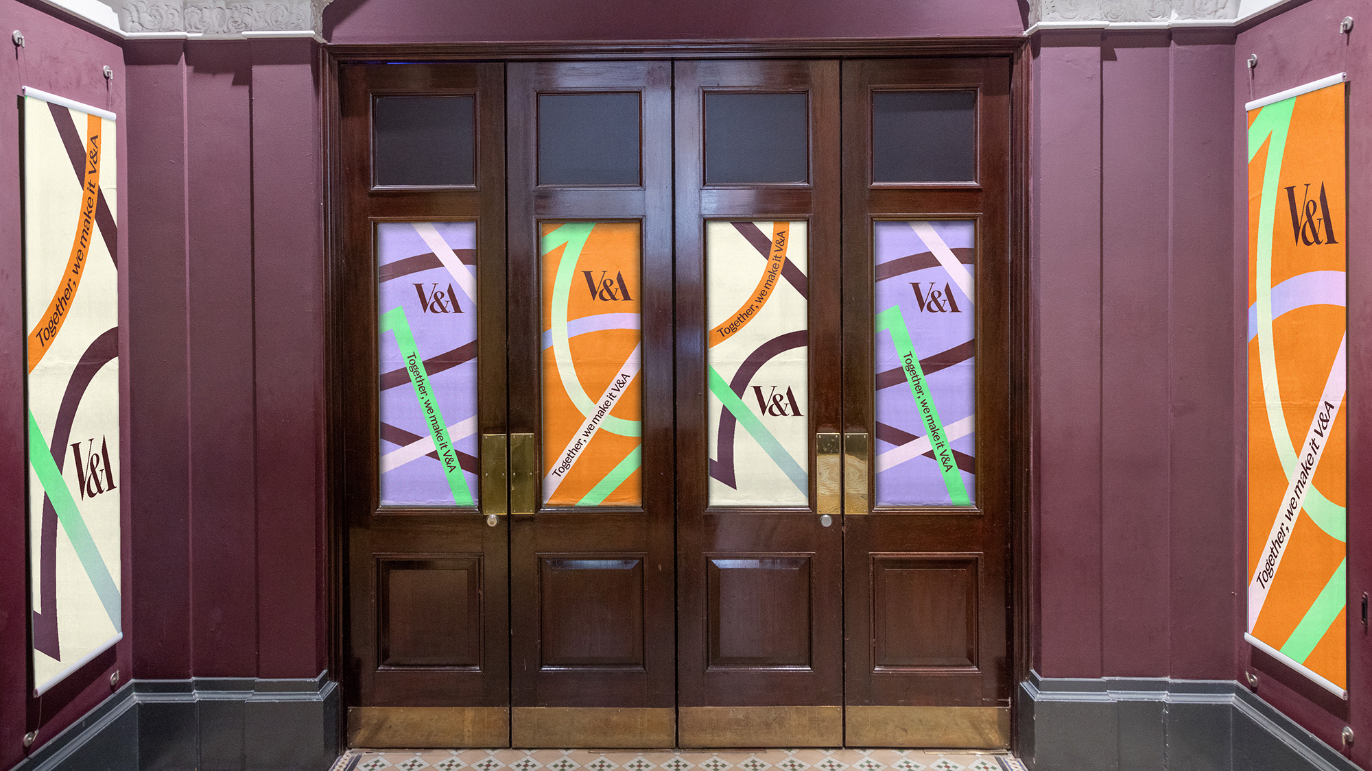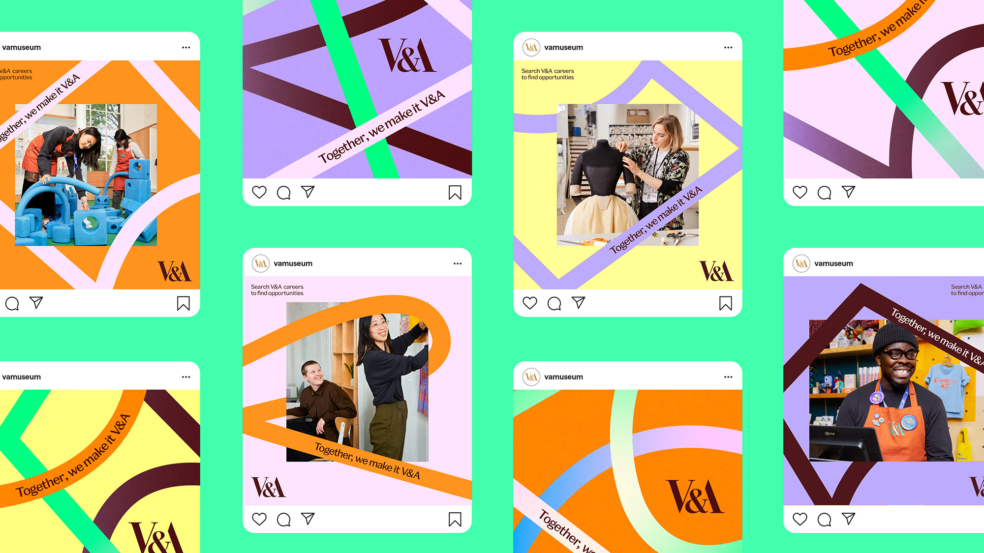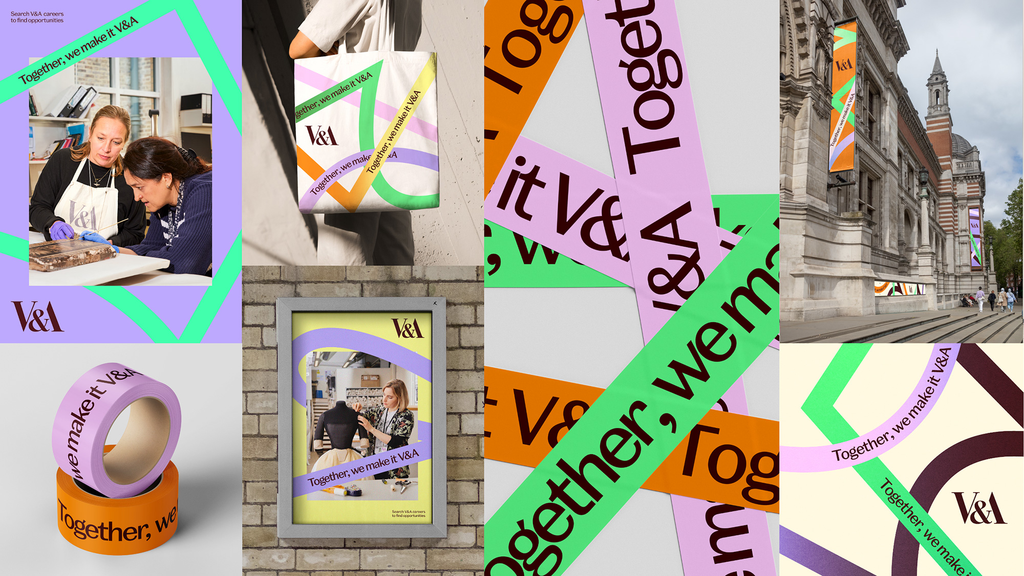 基于V&A現(xiàn)有的員工價(jià)值主張“Together, we make it V&A”(我們共同塑造V&A),Wonderhood Design(倫敦設(shè)計(jì)公司)旨在通過(guò)這一設(shè)計(jì)理念,將員工置于品牌標(biāo)識(shí)的核心,創(chuàng)造一個(gè)簡(jiǎn)潔而大膽的圖形元素,將博物館內(nèi)多樣化的角色緊密聯(lián)系在一起。