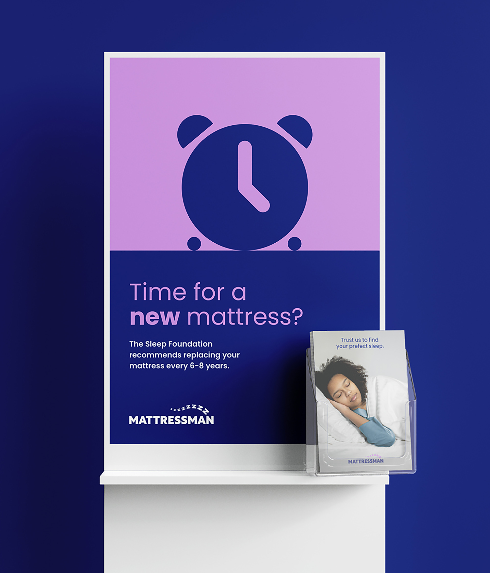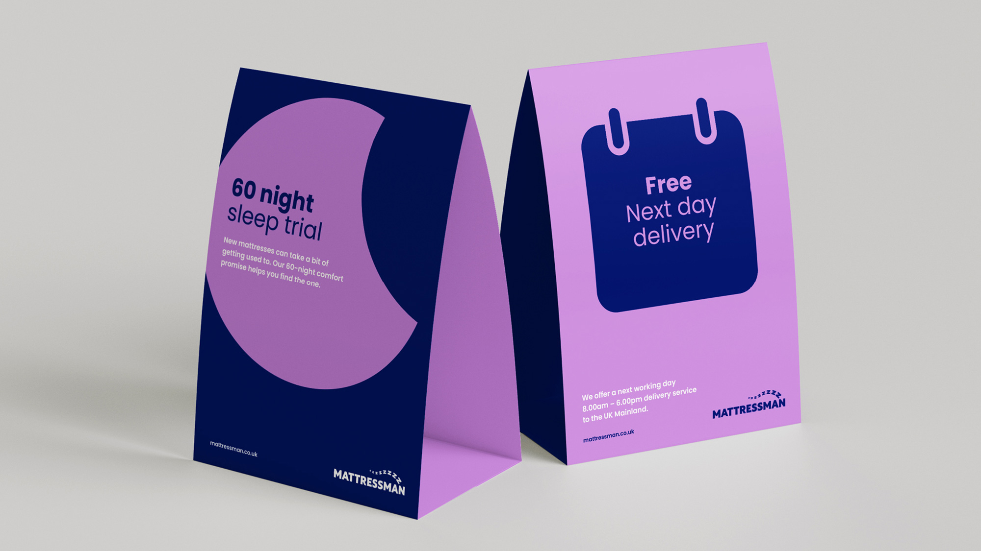 在顏色選擇上,Mattressman堅(jiān)持使用了藍(lán)色作為品牌標(biāo)志性顏色已有二十年之久。設(shè)計(jì)團(tuán)隊(duì)在優(yōu)化具體色調(diào)時(shí),特意保留了這一品牌傳統(tǒng),并搭配了一種舒緩、夢(mèng)幻的紫色,寓意著寧?kù)o的夜晚和美好的夢(mèng)境。這種顏色組合不僅與品牌的睡眠主題相契合,還能在視覺(jué)上營(yíng)造出一種溫馨、舒適的氛圍。