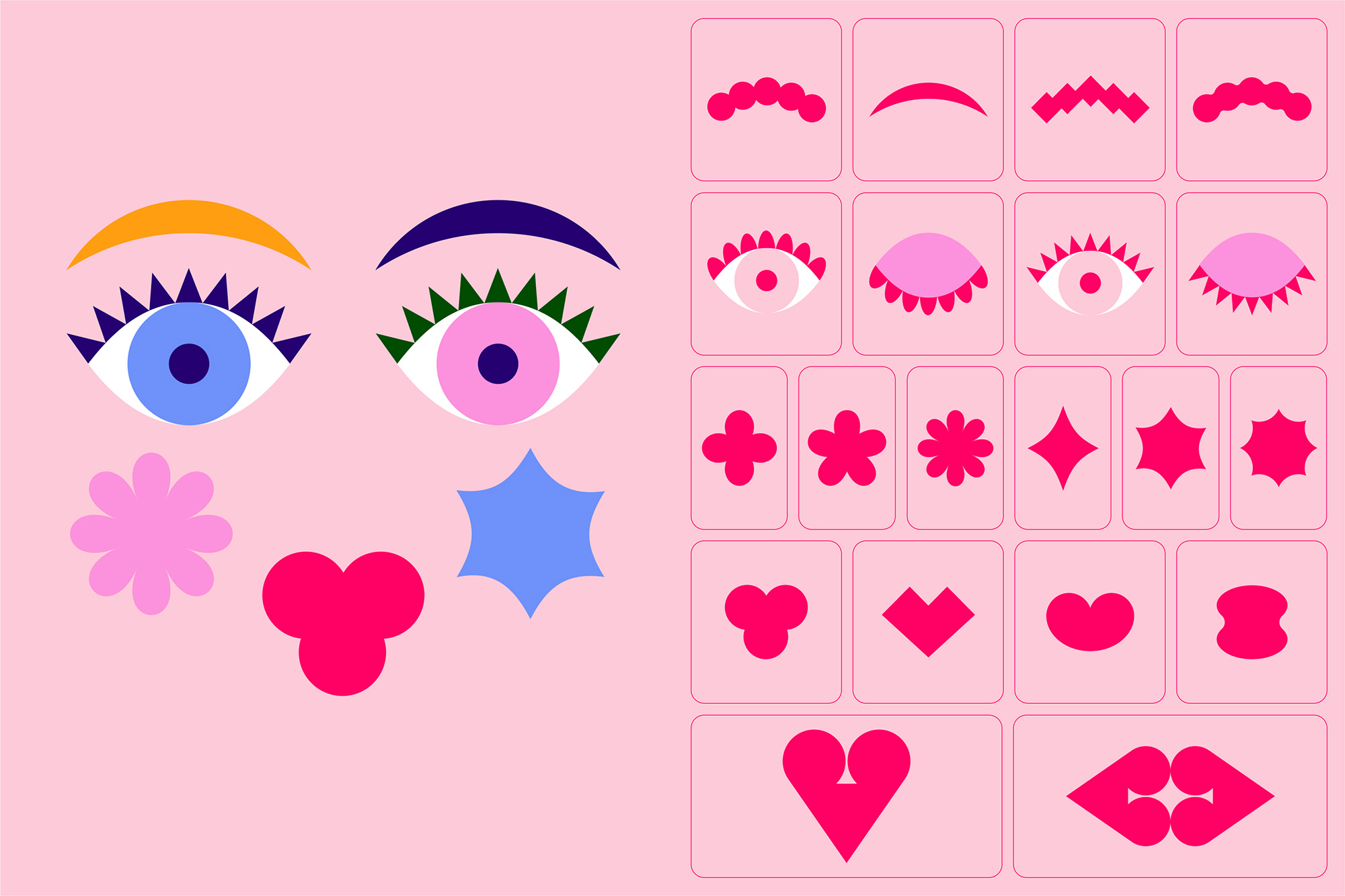 新VI設(shè)計(jì)中,圖形語(yǔ)言充滿趣味性,靈感源自品牌起源“The Face Place”及雙胞胎創(chuàng)始人的故事。圖形由可靈活組合的抽象面部元素(如臉頰、眼睛、眉毛和嘴唇)構(gòu)成,象征品牌的多變與適應(yīng)性。顏色方面,粉色不再局限于單一色調(diào),而是與紅色、紫色、黑色等結(jié)合,形成更具層次感的視覺(jué)表達(dá)。這種設(shè)計(jì)既保留了品牌的親和力,又增添了年輕化的活力。