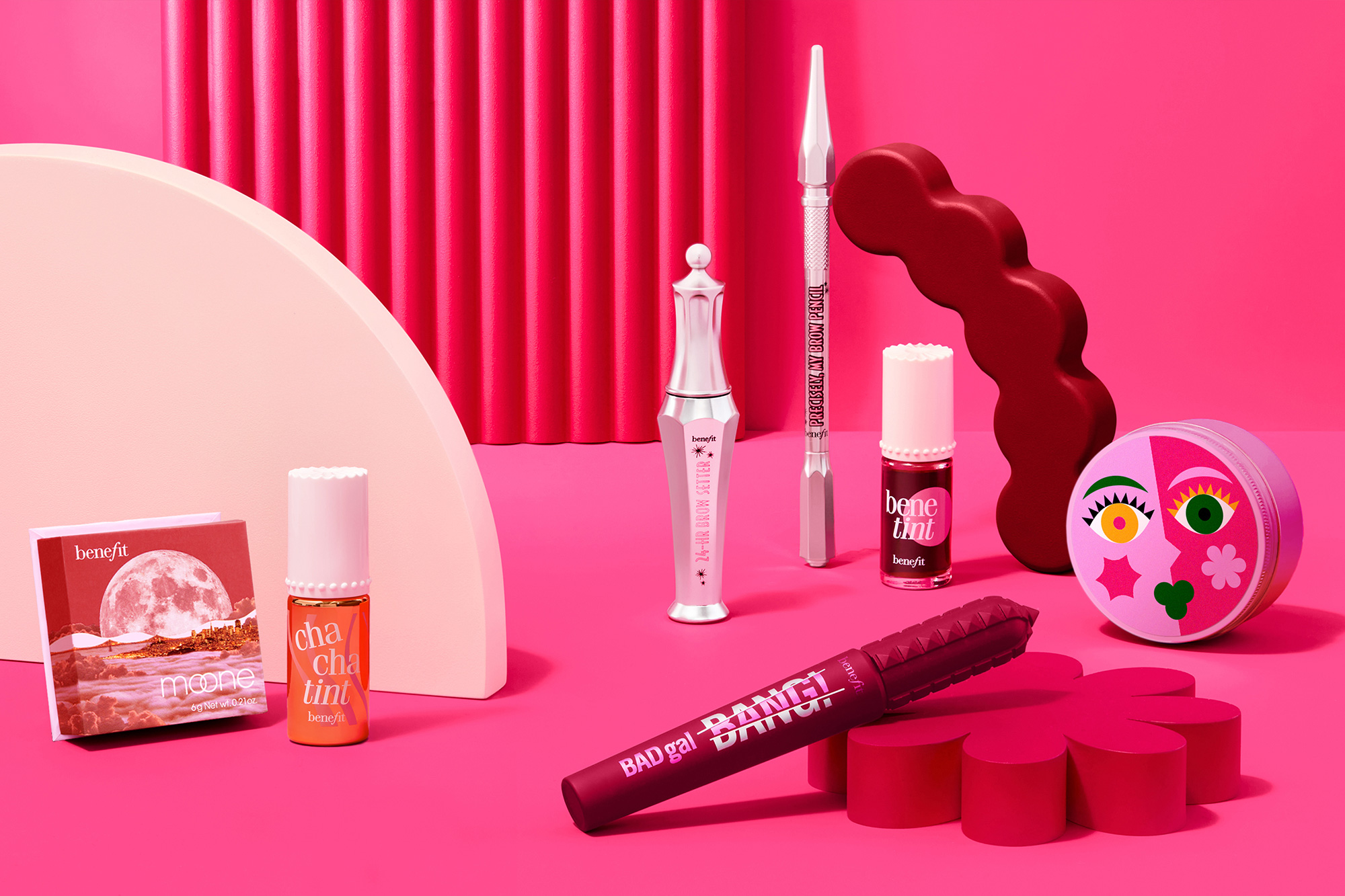 Wolff Olins作為Benefit的合作伙伴,主導(dǎo)了此次品牌形象升級(jí)。設(shè)計(jì)團(tuán)隊(duì)以“點(diǎn)燃?xì)g樂(lè)”為核心,從傳奇設(shè)計(jì)團(tuán)體Memphis Group的玩味風(fēng)格中汲取靈感,將Benefit的經(jīng)典視覺(jué)元素現(xiàn)代化。新設(shè)計(jì)平衡了品牌的高端創(chuàng)新與趣味個(gè)性,既保留了原有粉色標(biāo)識(shí)的標(biāo)志性,又賦予其更強(qiáng)的動(dòng)態(tài)感和態(tài)度。