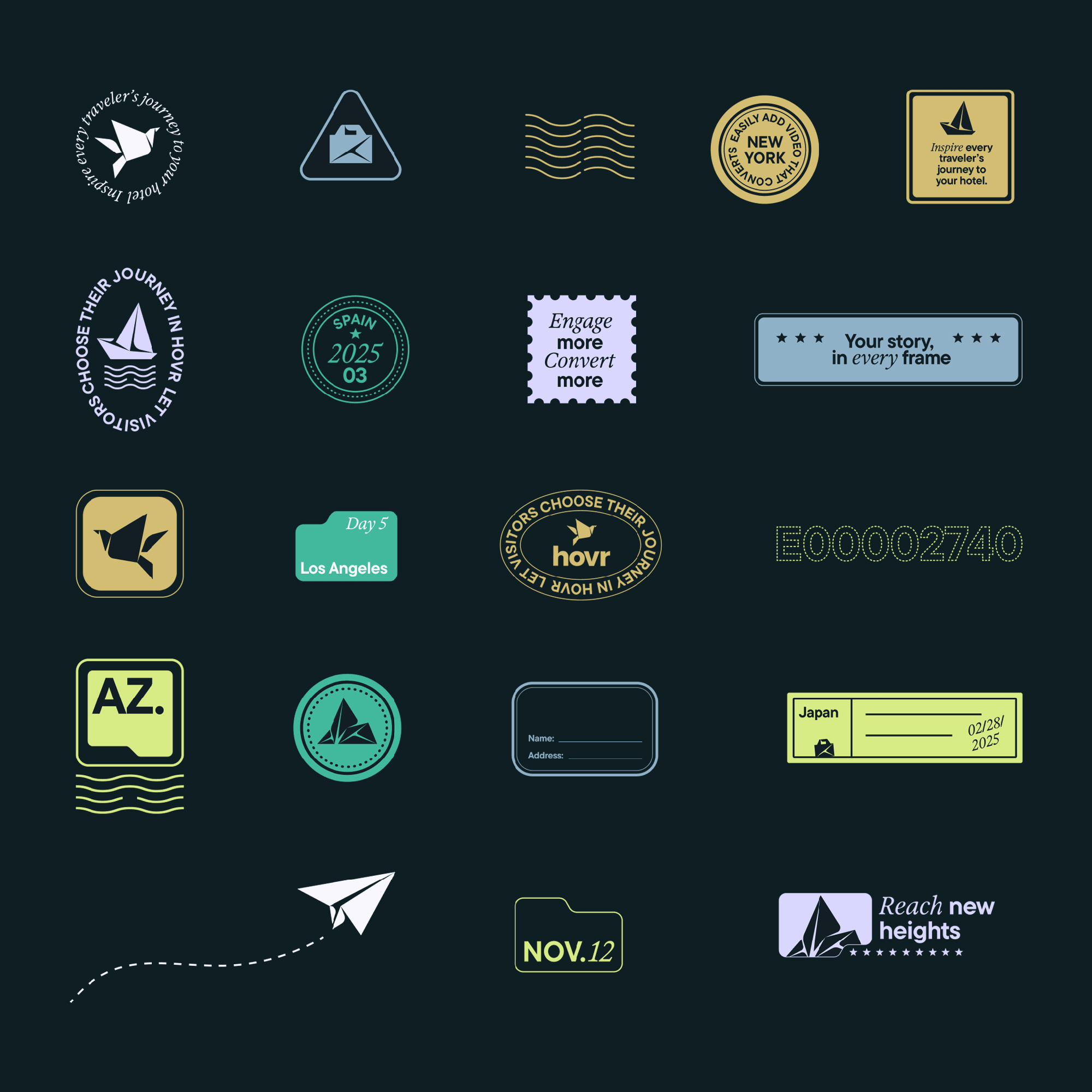 “旅游科技的vi設計必須突破工具屬性,”The Collected Works創(chuàng)意總監(jiān)指出,”我們用折紙鳥構建技術人格化IP,郵票圖形喚醒旅行記憶,這正是Hovr區(qū)別于傳統(tǒng)MarTech產品的差異化策略。”