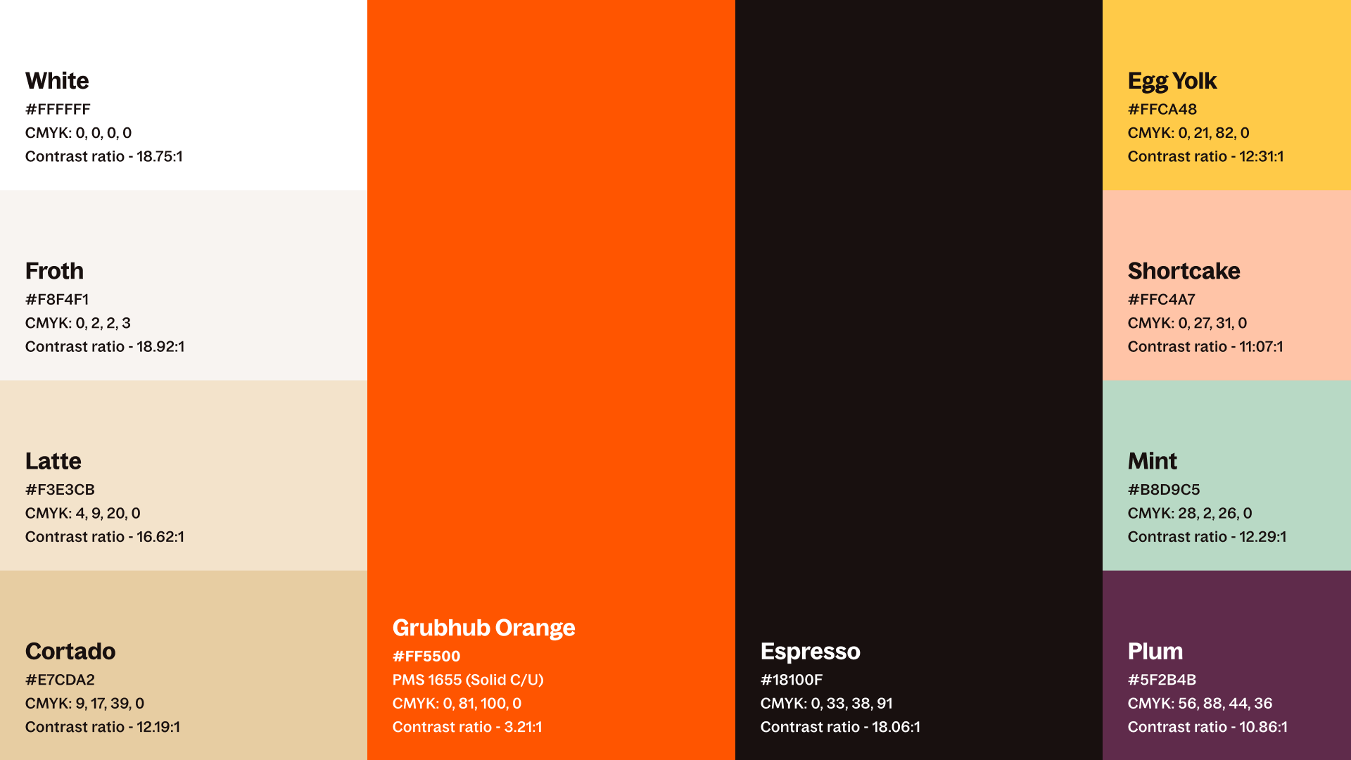 自2021年起,Grubhub便將橙色作為品牌的核心色彩。此次升級(jí)中,設(shè)計(jì)團(tuán)隊(duì)進(jìn)一步強(qiáng)化了橙色的運(yùn)用,使其更加鮮明、亮麗。新的橙色不僅具有更強(qiáng)的對(duì)比度和飽和度,還能在各種觸點(diǎn)上脫穎而出。圍繞這一核心色彩,設(shè)計(jì)團(tuán)隊(duì)構(gòu)建了一個(gè)完整的色彩系統(tǒng),與食品圖像無縫搭配,營造出統(tǒng)一、誘人且難以忽視的品牌體驗(yàn)。
