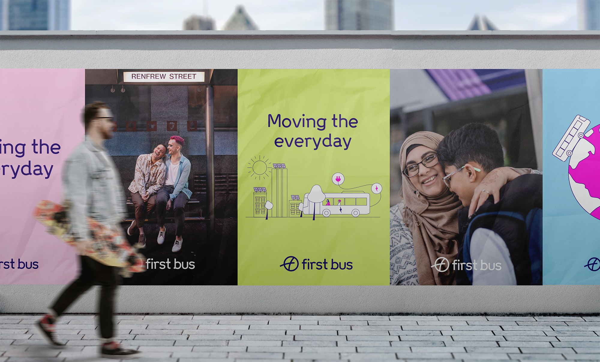 MadeBrave設(shè)計公司(位于蘇格蘭格拉斯哥)承擔(dān)了此次First Bus的品牌重塑任務(wù)。設(shè)計團隊深入調(diào)研后發(fā)現(xiàn),盡管公眾對公交品牌普遍持冷漠態(tài)度,但對公交車本身卻充滿深厚情感。因此,設(shè)計團隊決定以“moving the everyday”為核心平臺,通過展現(xiàn)日常生活中的美好、幽默與魔力,來重塑First Bus的品牌形象。這一理念不僅體現(xiàn)了公交服務(wù)的普遍性和日常性,也強調(diào)了公交在連接人與人、推動社會進步中的重要作用。