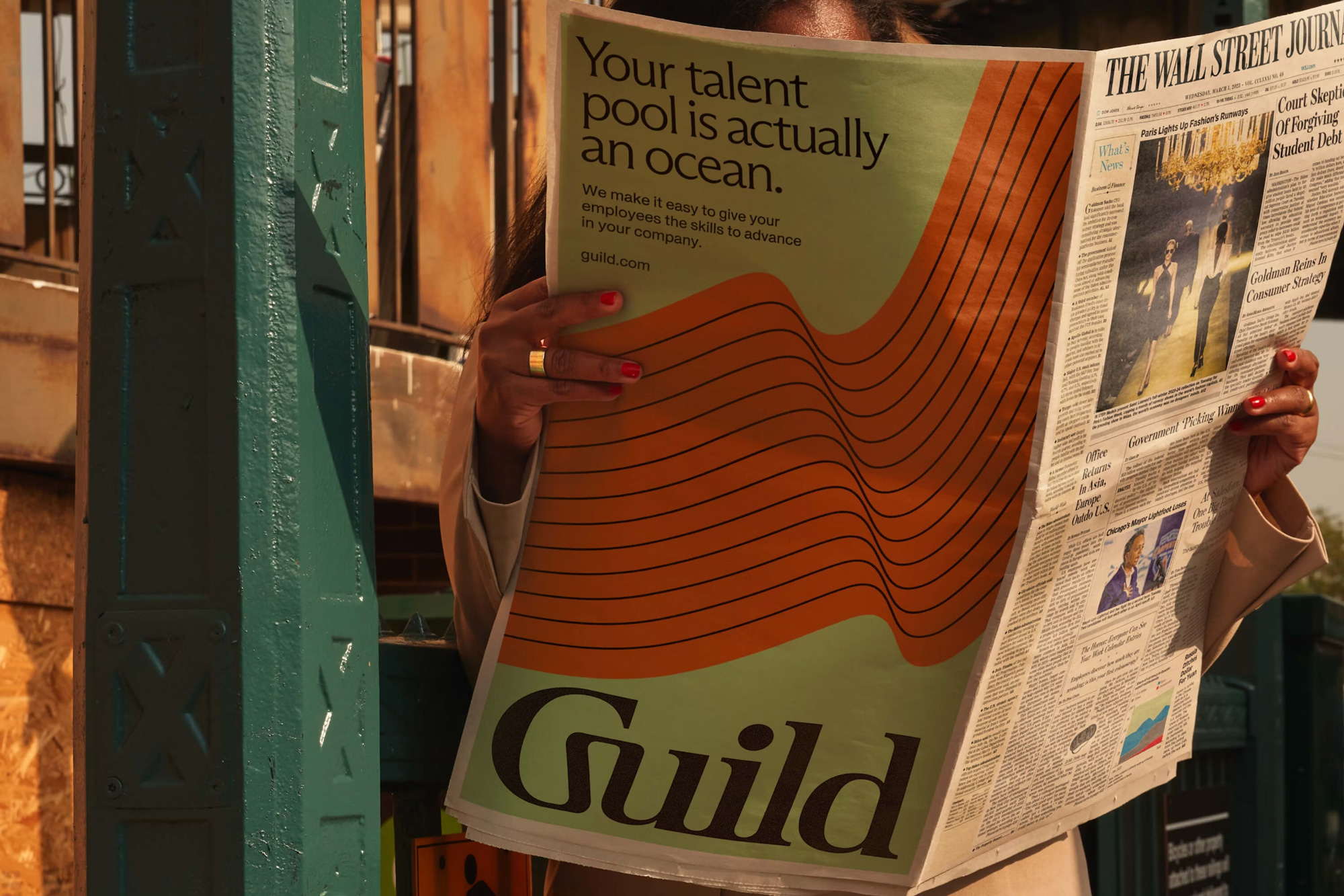 新logo的設(shè)計獨具匠心,采用了豐富的連字和獨特的字形,使得“Guild”這個詞本身足夠醒目,易于識別。新形象還引入了一些不同的設(shè)計元素,如扭曲、轉(zhuǎn)折、縮放和滑動的細黑線條,以及具有獨特色彩和重復照片的肖像。這些元素共同營造出一種編輯與高等教育的氛圍,同時帶有微妙的奢華底蘊,讓雇主相信他們的錢花在了這個員工繼續(xù)教育平臺上。