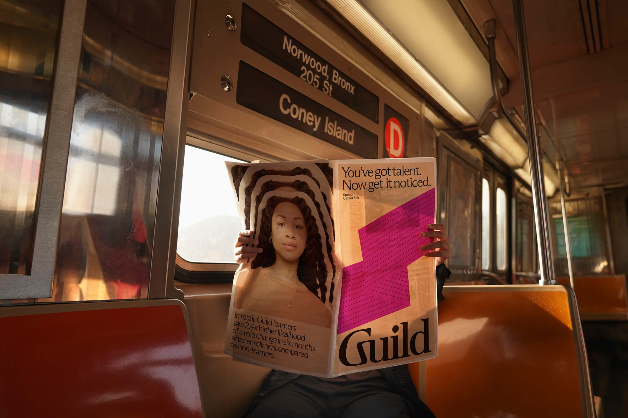 自2015年成立以來,Guild一直致力于幫助具有前瞻性的雇主通過教育和學習計劃、職業(yè)發(fā)展以及一對一輔導來投資他們的員工,從而解鎖個人和職業(yè)成長的改變生活的機會。Guild與全國最大的雇主合作,創(chuàng)造一種機會文化,這將有助于他們吸引和留住頂尖人才,同時建立未來的勞動力。然而,隨著Guild的發(fā)展,其原有的品牌形象已無法準確傳達其作為“教育市場制造者”的新定位,旨在提高美國低收入勞動力的社會經(jīng)濟流動性。因此,Guild決定與COLLINS合作,進行品牌重塑。