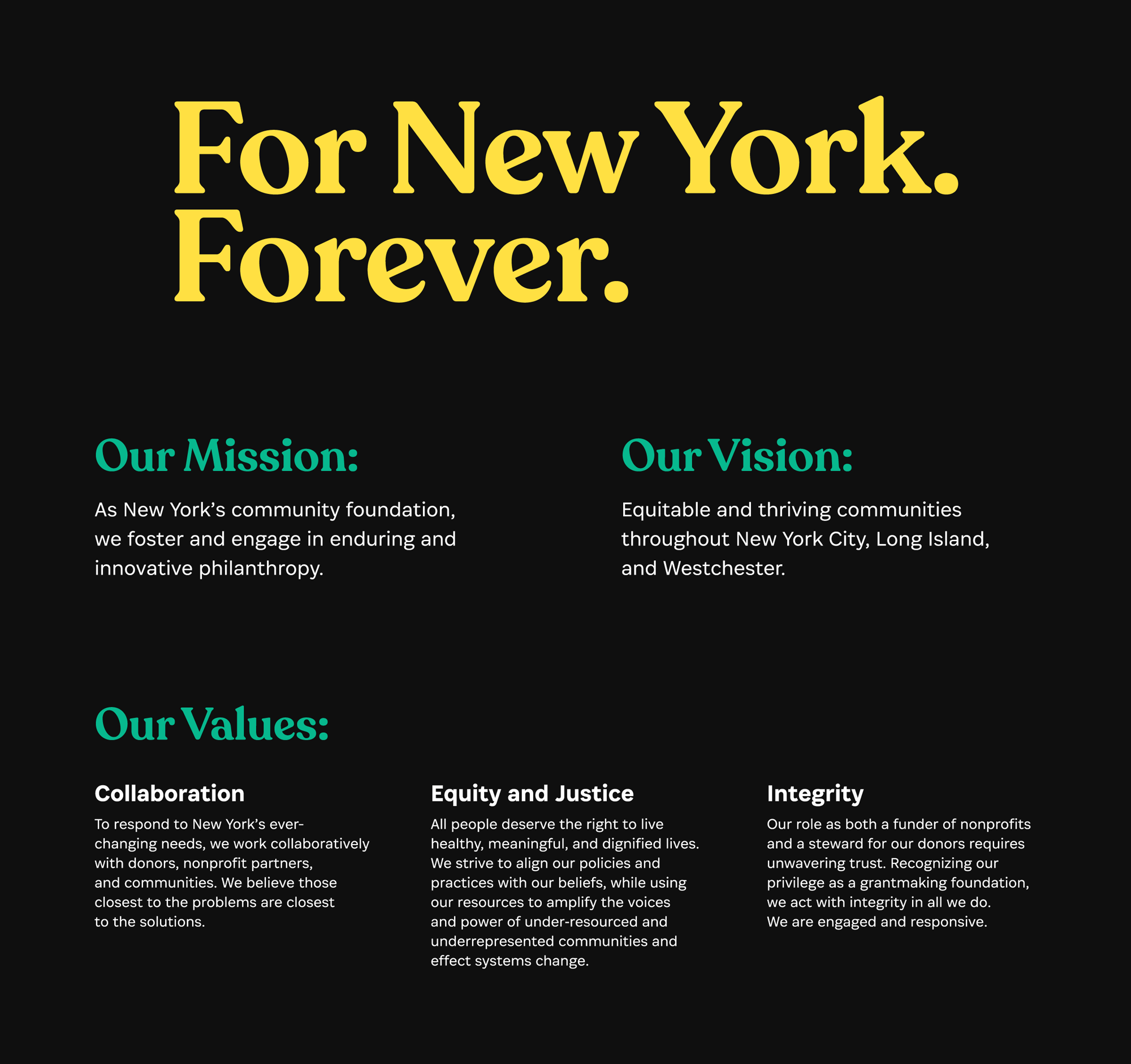 紐約社區(qū)信托(The New York Community Trust),作為紐約最大的社區(qū)基金會(huì),自1924年成立以來,一直致力于推動(dòng)和參與持久且創(chuàng)新的慈善事業(yè)。它通過資助項(xiàng)目,匯聚團(tuán)隊(duì)、非營(yíng)利組織和合作伙伴的多元本地知識(shí)和專業(yè)技能,幫助捐贈(zèng)者實(shí)現(xiàn)他們對(duì)所熱愛事業(yè)的愿景。從教育和藝術(shù)到醫(yī)療保健和環(huán)境,紐約社區(qū)信托力求改善紐約市、長(zhǎng)島和威斯特徹斯特的文化和公民生活的每一個(gè)方面。值此百年慶典之際,紐約社區(qū)信托展望未來,期待為紐約客帶來下一個(gè)百年的生活改善。