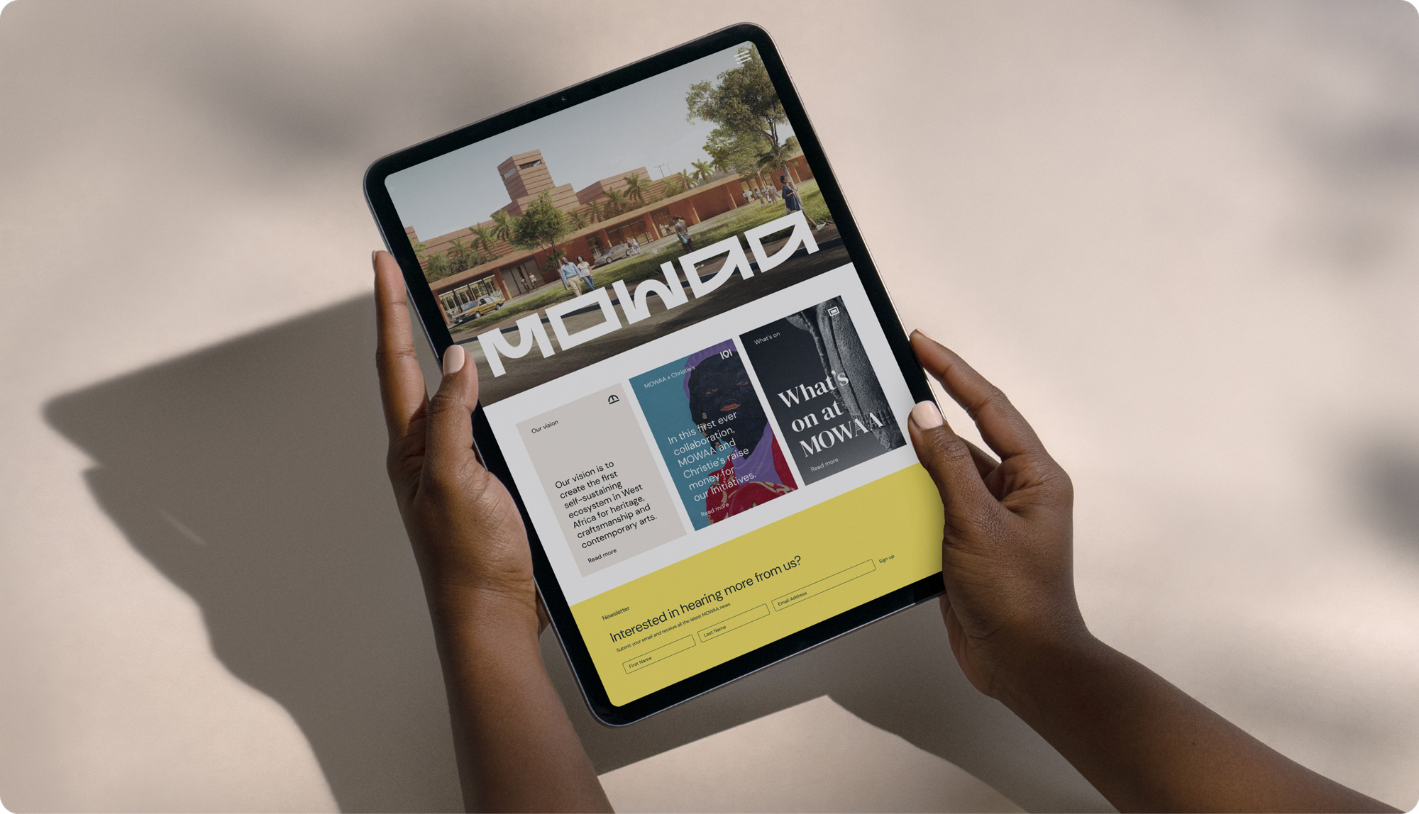 在新LOGO的設(shè)計(jì)理念上,Human After All巧妙地找到了傳統(tǒng)與現(xiàn)代之間的平衡點(diǎn)。他們深受MOWAA建筑風(fēng)格的啟發(fā),將建筑中的Edo元素與當(dāng)代拱門相結(jié)合,轉(zhuǎn)化為一種可以堆疊或水平對(duì)齊的標(biāo)記。這種設(shè)計(jì)不僅反映了建筑空間的靈活性,還體現(xiàn)了博物館內(nèi)各種元素的融合。新LOGO在保持簡(jiǎn)約風(fēng)格的同時(shí),通過夸張的筆畫賦予每個(gè)字母更加獨(dú)特和鮮明的個(gè)性,從而微妙地傳達(dá)出非洲藝術(shù)更為戲劇化和富有表現(xiàn)力的特質(zhì)。