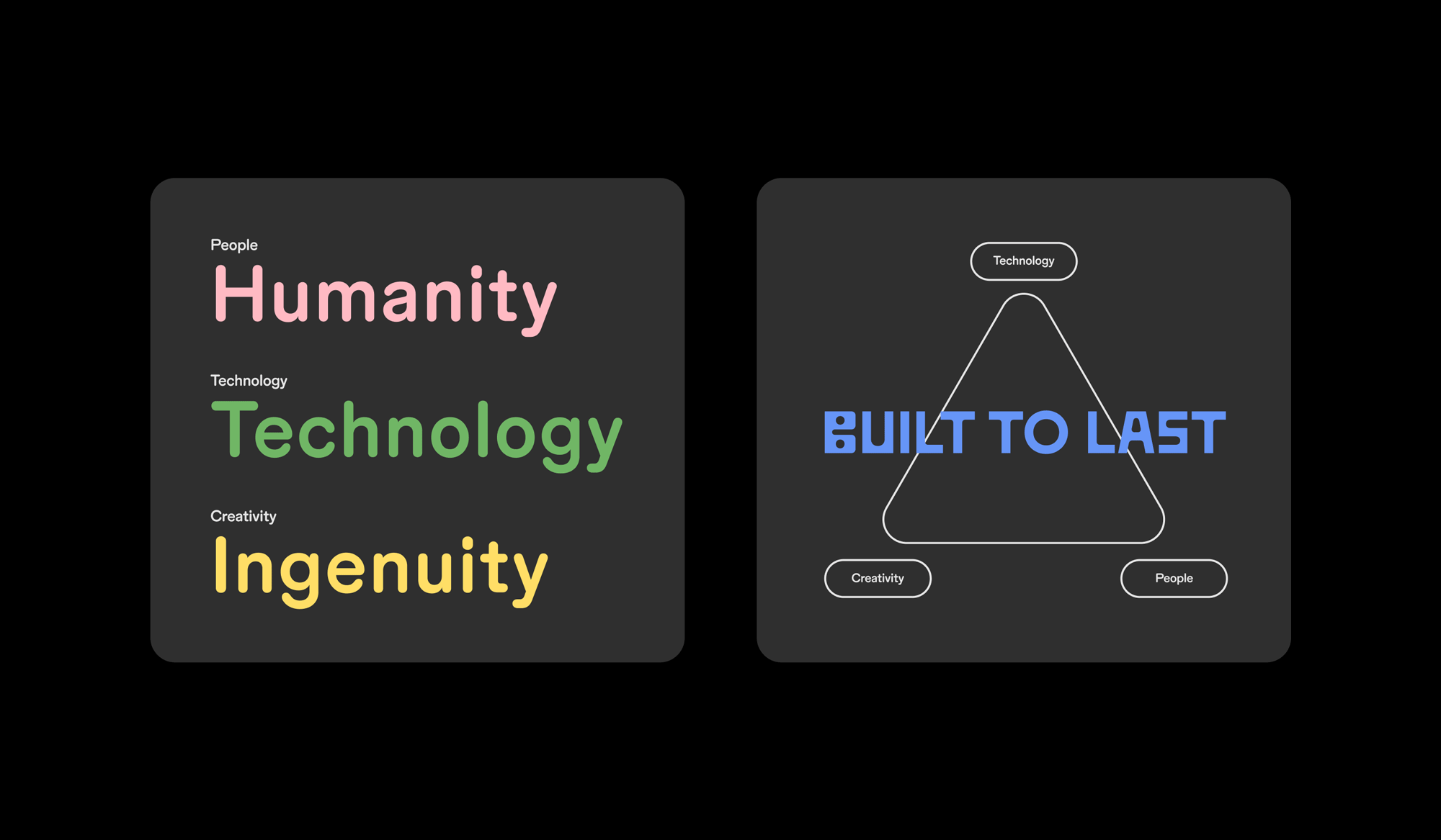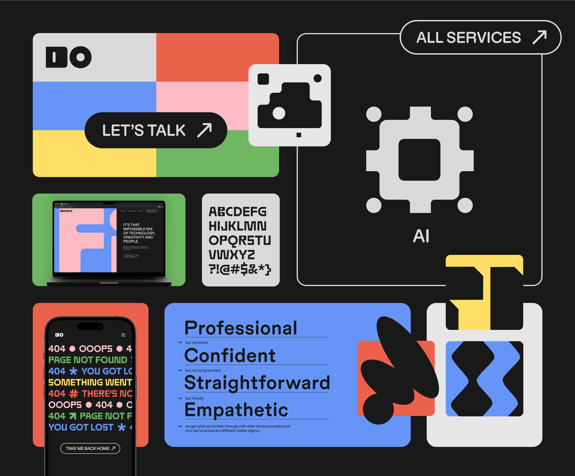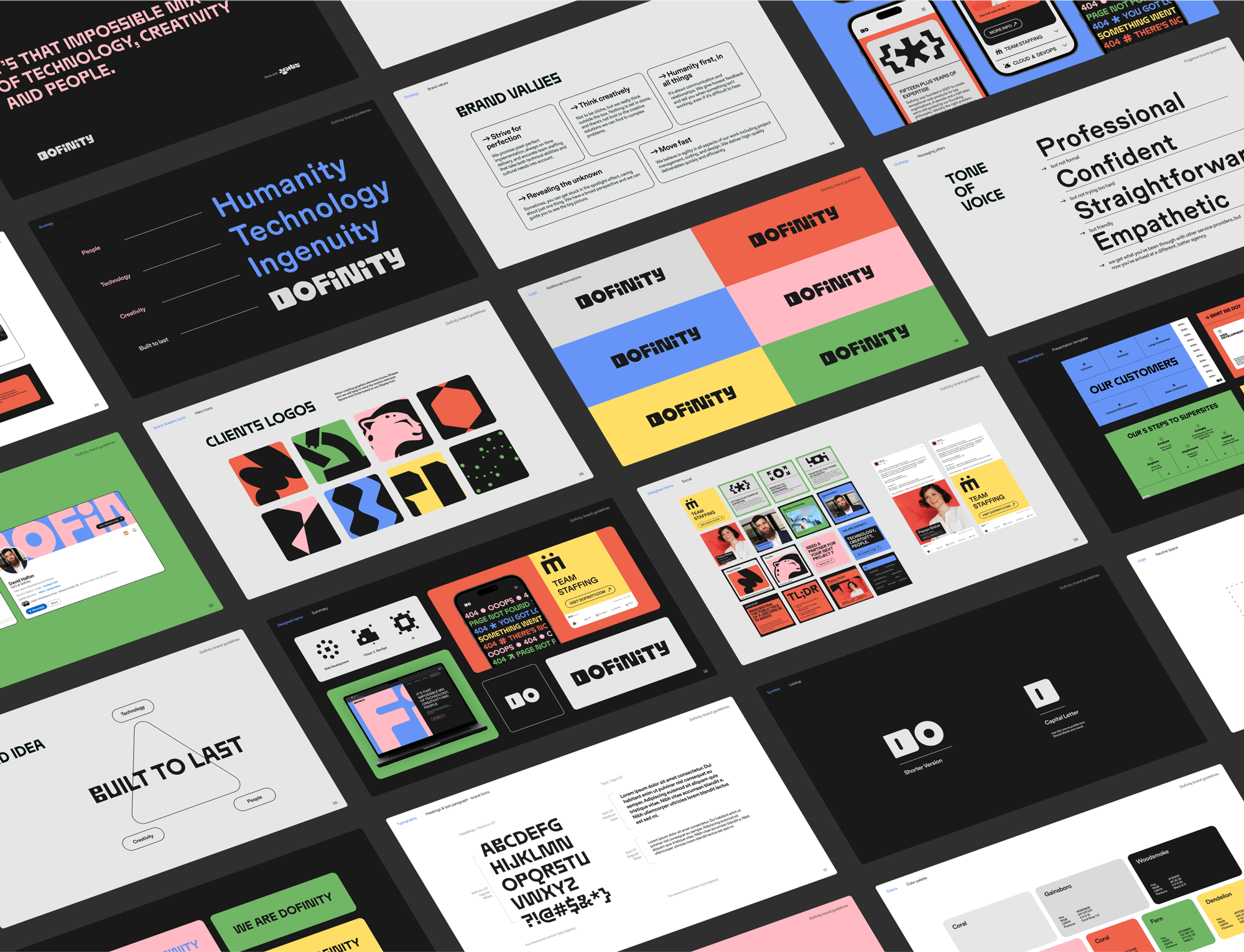 “建基于恒”是Dofinity的品牌故事。它代表著經(jīng)典而非潮流,細心而非急躁,誠實而非虛假承諾——即使那份誠實可能有些刺耳。品牌的傳達理念是,Dofinity擁有“不可能的組合:技術、創(chuàng)造力和合適的人才”,這是他們構建品牌的方式。為了體現(xiàn)“建基于恒”,我們選擇了大膽醒目的字體和堅實的形狀,并避開了2020年代品牌設計中新興的趨勢,如卷曲的襯線和3D形狀,轉而采用更經(jīng)典、隨時間沉淀下來的元素和色彩。在視覺上,我們力求展現(xiàn)Dofinity的獨特之處:一方面堅實可靠,另一方面又充滿人性和創(chuàng)造力。
