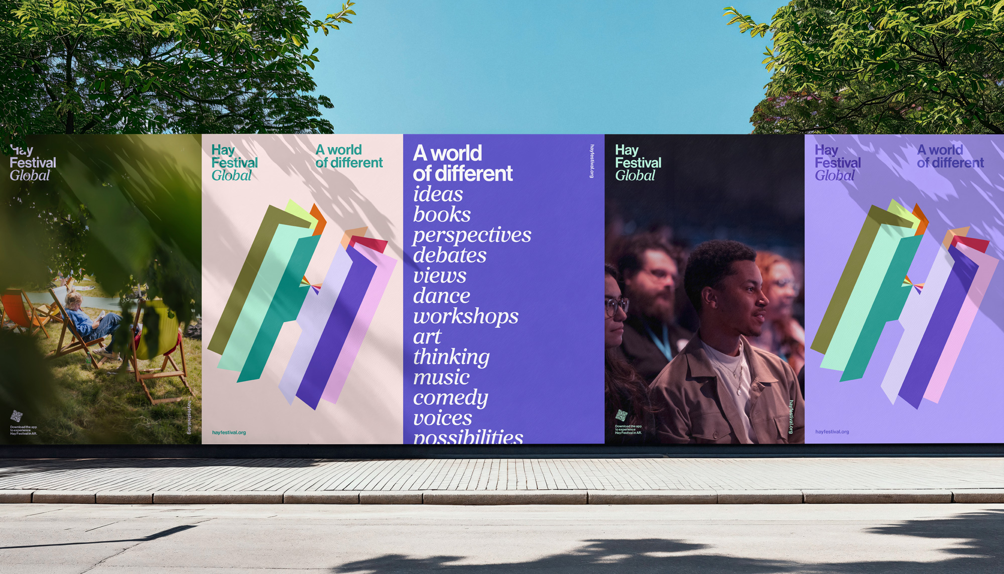 新視覺形象的核心是一個動態(tài)、多層次的“H”形標志,它巧妙地模擬了書頁圍繞書脊翻轉(zhuǎn)的形態(tài),既呼應了Hay Festival的文學根源,又通過23.5度的傾斜角度(與地球自轉(zhuǎn)軸相同)象征著品牌的全球視野與開放性。標志的色彩與書頁數(shù)量可根據(jù)不同場合與需求進行調(diào)整,展現(xiàn)出極高的靈活性與適應性。配合“a world of different”這一品牌理念,新視覺形象旨在邀請人們進入一個充滿不同故事、思想與可能性的世界。