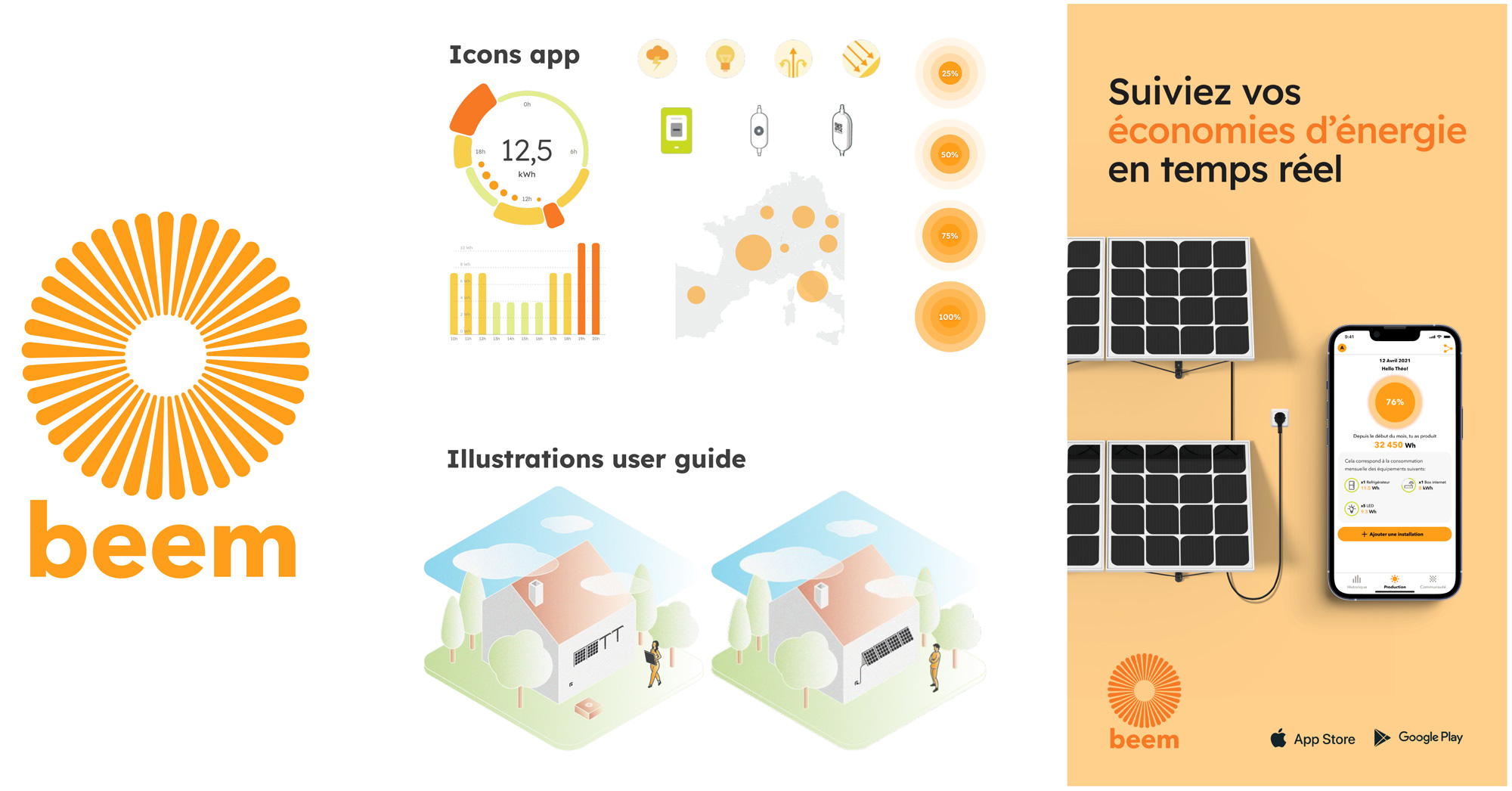 Seenk(位于法國(guó)巴黎)負(fù)責(zé)了Beem的品牌設(shè)計(jì)工作。其設(shè)計(jì)理念深受Beem產(chǎn)品及其用戶(hù)積極情緒的影響,創(chuàng)造出一個(gè)充滿(mǎn)愉悅感的品牌形象。新標(biāo)志設(shè)計(jì)巧妙,由幾個(gè)房屋形狀組成太陽(yáng)圖案,同時(shí)描繪了地球,房屋環(huán)繞其周?chē)瑐鬟_(dá)出向可持續(xù)能源集體邁進(jìn)的寓意。品牌承諾“You have the energy”邀請(qǐng)每個(gè)人參與這一變革。當(dāng)用戶(hù)在應(yīng)用程序中看到自己生產(chǎn)的第一批瓦特時(shí),他們表達(dá)出如此強(qiáng)烈的愉悅和自豪感,以至于幾乎每天都會(huì)登錄以追蹤生產(chǎn)狀態(tài)。