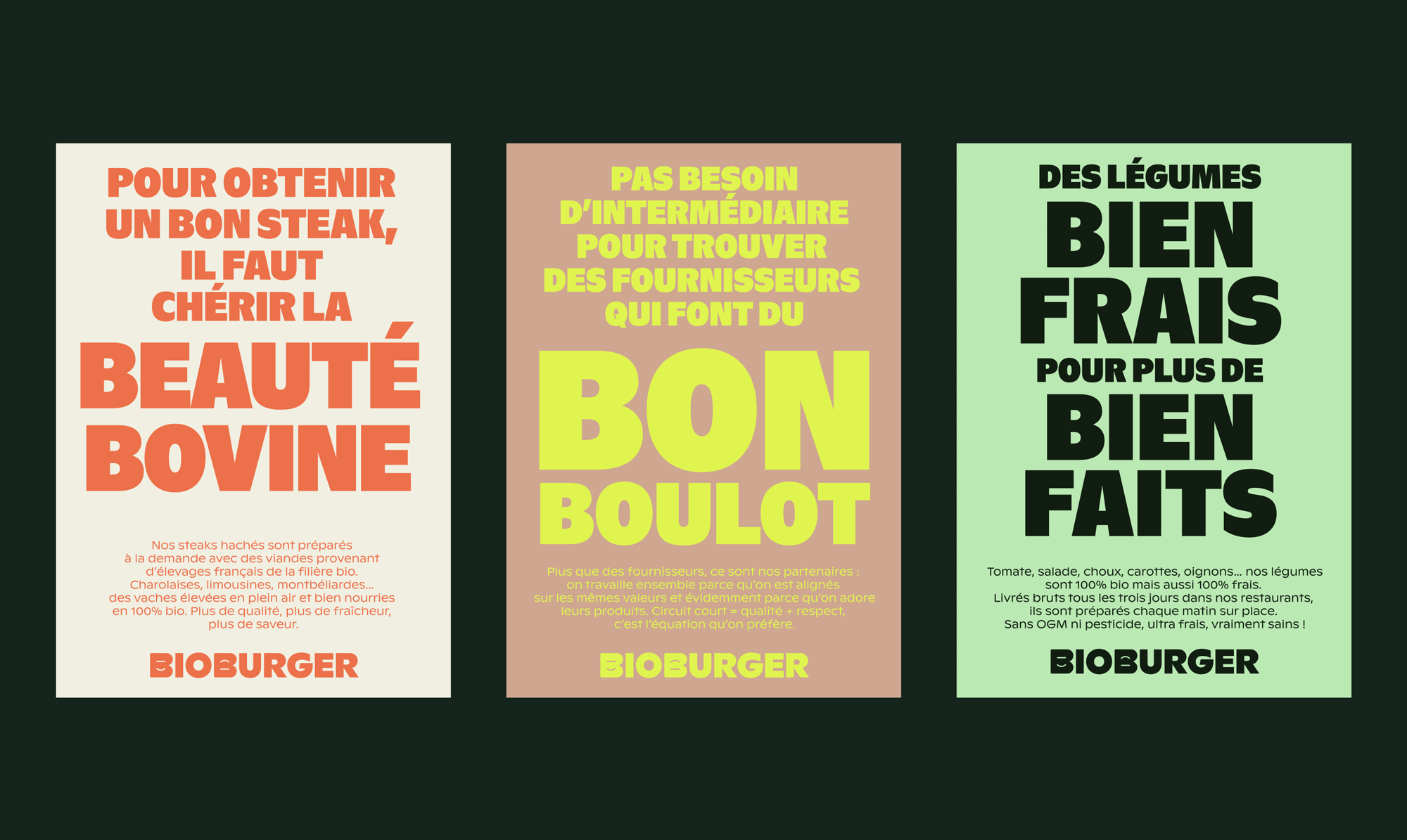 為了解決這個(gè)問(wèn)題,Bioburger攜手法國(guó)設(shè)計(jì)公司Abmo進(jìn)行了一場(chǎng)為期一年的品牌重塑工程。新品牌形象的目標(biāo)是打造一個(gè)具有影響力、美味、酷炫且令人向往的視覺(jué)識(shí)別系統(tǒng),以將自己定位為未來(lái)的“有承諾的快餐”。新設(shè)計(jì)包括一個(gè)大膽、令人垂涎且充滿樂(lè)趣的Logo,采用活力的橙色與傳統(tǒng)深綠色相結(jié)合,同時(shí)選用現(xiàn)代感十足的Ginto Nord字體來(lái)增強(qiáng)醒目的標(biāo)題。品牌的語(yǔ)調(diào)簡(jiǎn)潔、直接且富有趣味性,反映了品牌的精神狀態(tài)。