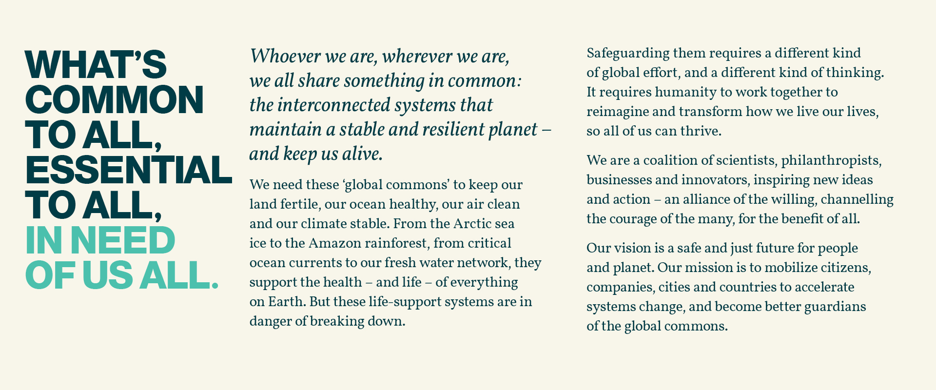 在全球氣候變化和環(huán)境問題日益嚴峻的背景下,“全球公域聯(lián)盟”(Global Commons Alliance)應運而生,它是一個由超過100個合作伙伴組成的聯(lián)盟,旨在加速系統(tǒng)變革,保護全球公域。該聯(lián)盟的工作主要通過地球委員會、系統(tǒng)變革實驗室、責任加速器、科學基目標網(wǎng)絡(luò)和地球總部等機構(gòu)協(xié)作完成。其使命是動員公民、公司、城市和國家加速系統(tǒng)變革,成為更好的全球公域守護者。