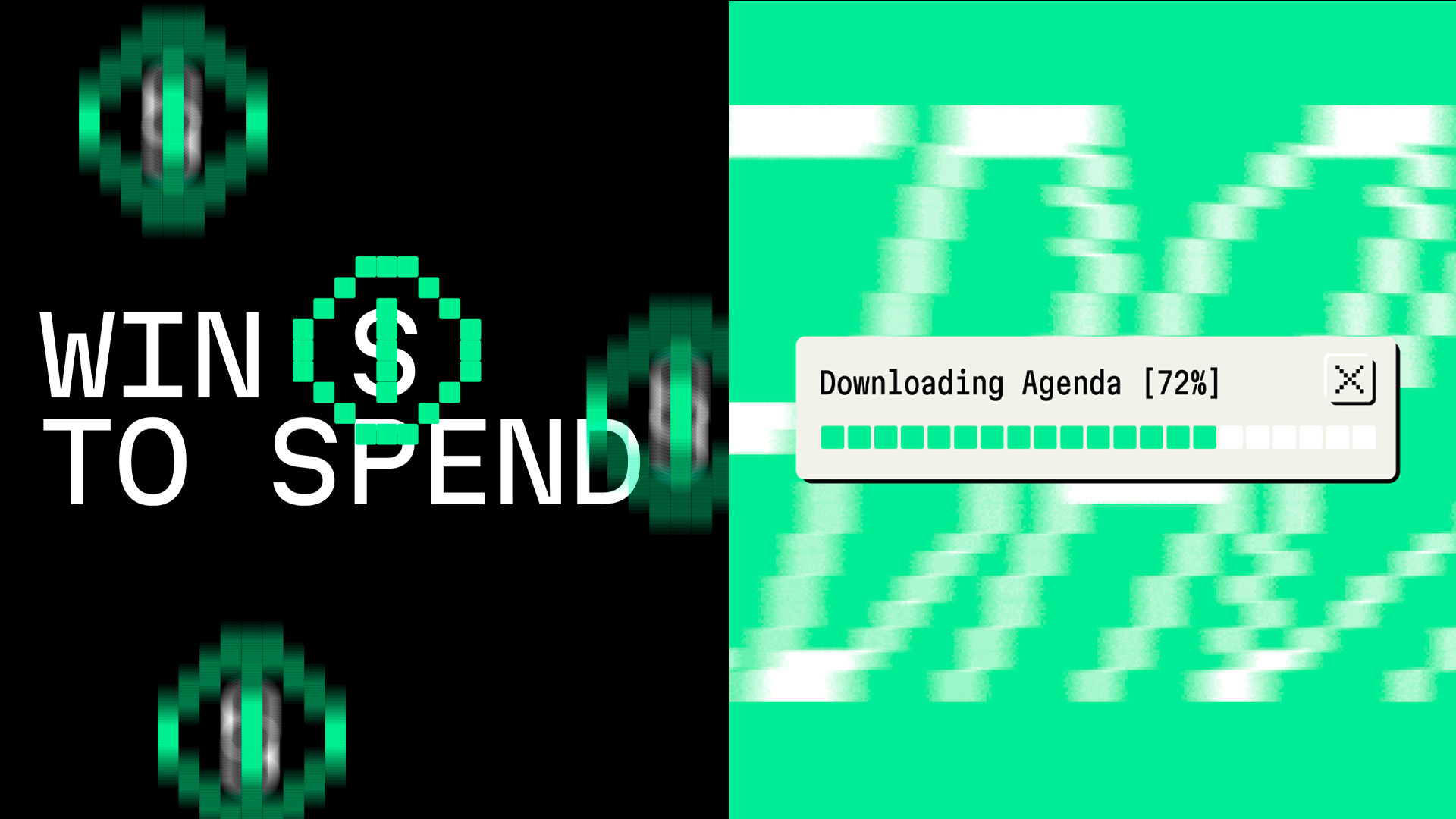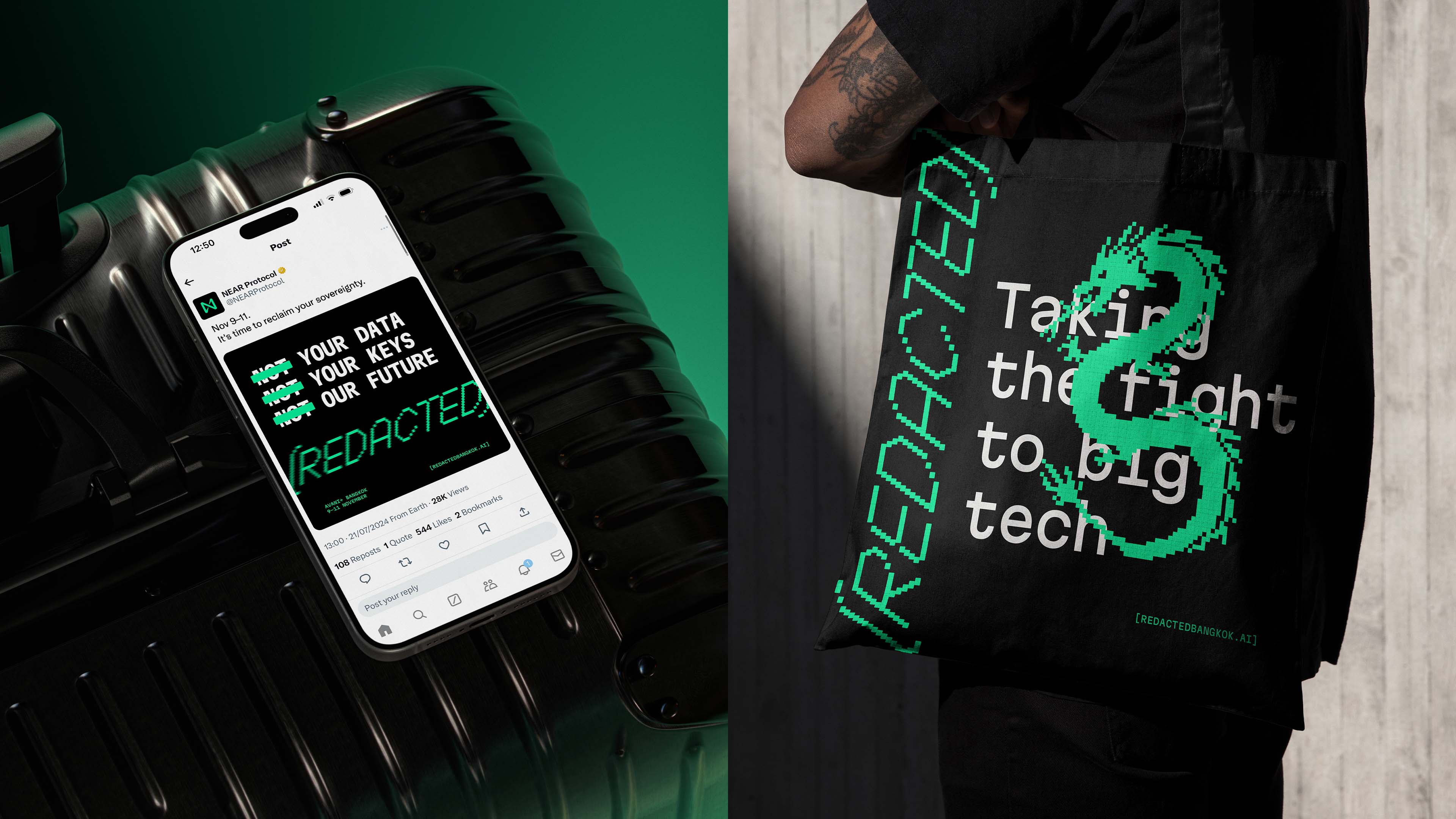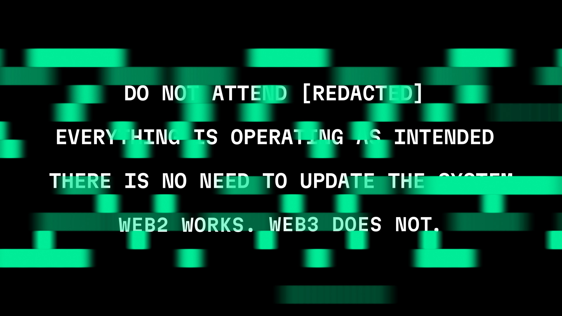 盡管Web3與區(qū)塊鏈的話題對我來說依然有些陌生,但我不得不承認,[REDACTED]項目所展現(xiàn)的反傳統(tǒng)、金融機構顛覆、低保真賽博朋克與超現(xiàn)實主義美學,確實令人印象深刻。從活動名稱到故障風格的圖形,這種美學貫穿始終。盡管我認為將其定位為革命性、改變地球軌跡的事件有些過于自大,但我確實被其動態(tài)設計與獨特的綠色、黑色與白色色調所吸引。特別是那些通過單個塊的位移來創(chuàng)造斜體的處理,以及即使有時使用過大也依然引人注目的單距字體。
