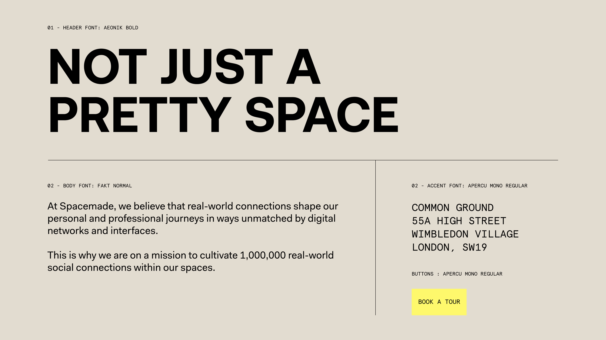在視覺識別設(shè)計(vi設(shè)計)方面,Spacemade采用了大膽且簡潔的字體選擇。頭條字體選用了Neo Grotesk家族的Aeonik,其粗體全大寫字母“散發(fā)出直接而簡單的語調(diào)”。正文則使用了干凈、現(xiàn)代的Fakt字體,以確保在各種應(yīng)用和尺度上的可讀性。而支持性文字,如地址和標識,則采用了由Colophon鑄造廠設(shè)計的工業(yè)風格Apercu Mono全大寫字體,以建立一種既強烈又易接近的語調(diào)。