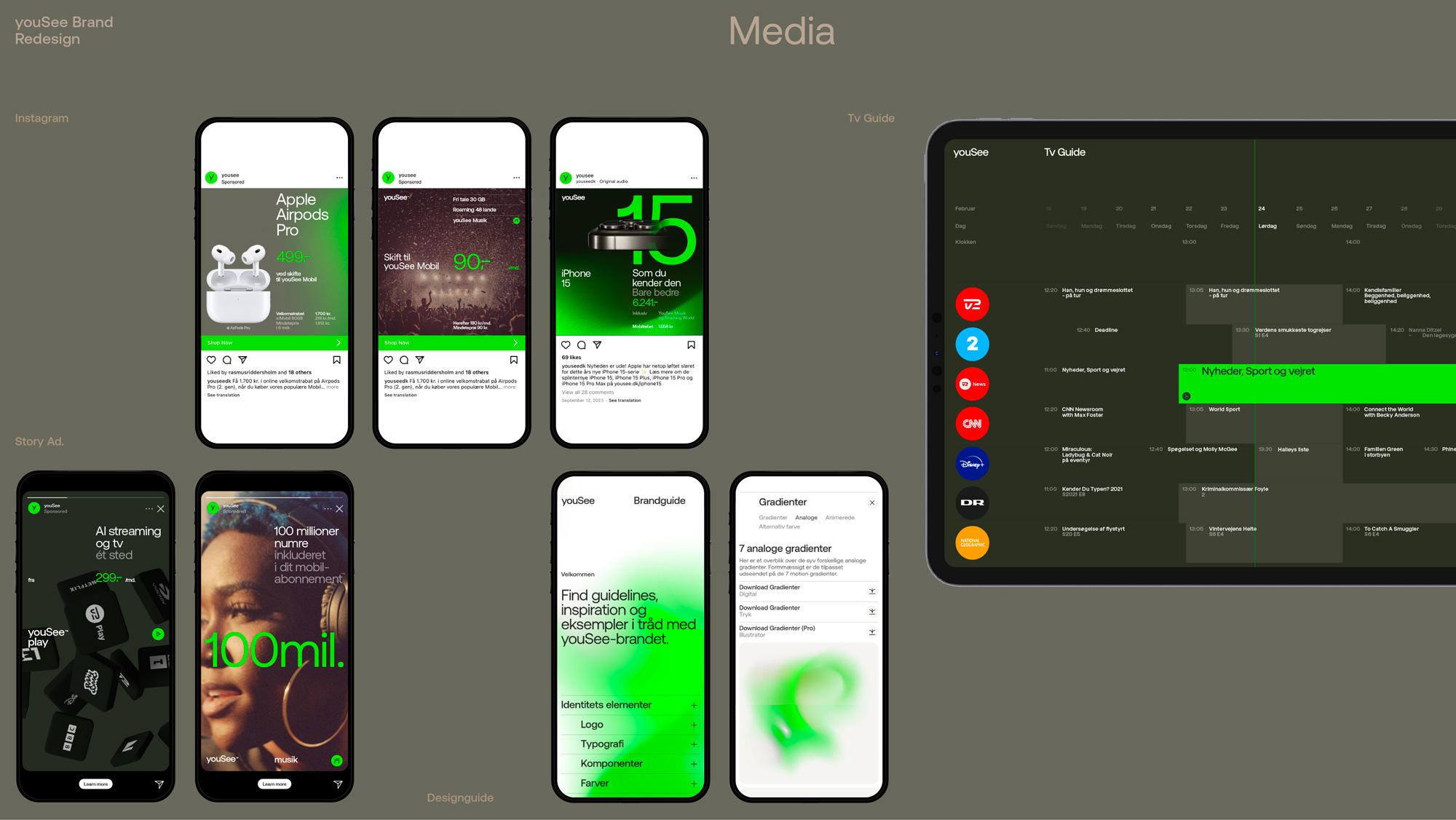 新品牌設(shè)計(jì)的核心在于其獨(dú)特的視覺(jué)識(shí)別系統(tǒng)。其中,品牌設(shè)計(jì)中的動(dòng)態(tài)漸變效果尤為引人注目。這些漸變不僅為品牌設(shè)計(jì)增添了活力,還巧妙地引導(dǎo)用戶的注意力,使媒體、信息或產(chǎn)品成為視覺(jué)焦點(diǎn)。色彩方面,YouSee選用了多樣化的色彩組合,但以強(qiáng)烈的品牌識(shí)別色——YouSee Green為主,用于突出重要信息,如價(jià)格或功能。背景色則來(lái)源于從深綠到淺綠的漸變分解,既保持了品牌的一致性,又賦予了媒體足夠的個(gè)性空間。