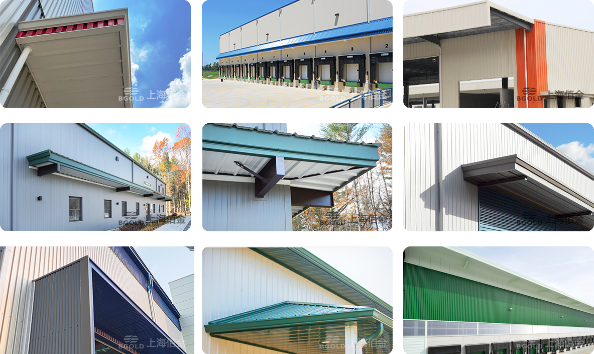 卸貨大雨棚:懸挑6~8米,采用同屋面的直立鎖縫板 ; 門上小雨棚:配合收邊顯得很精致,對整個建筑立面效果起著點綴的作用 ;